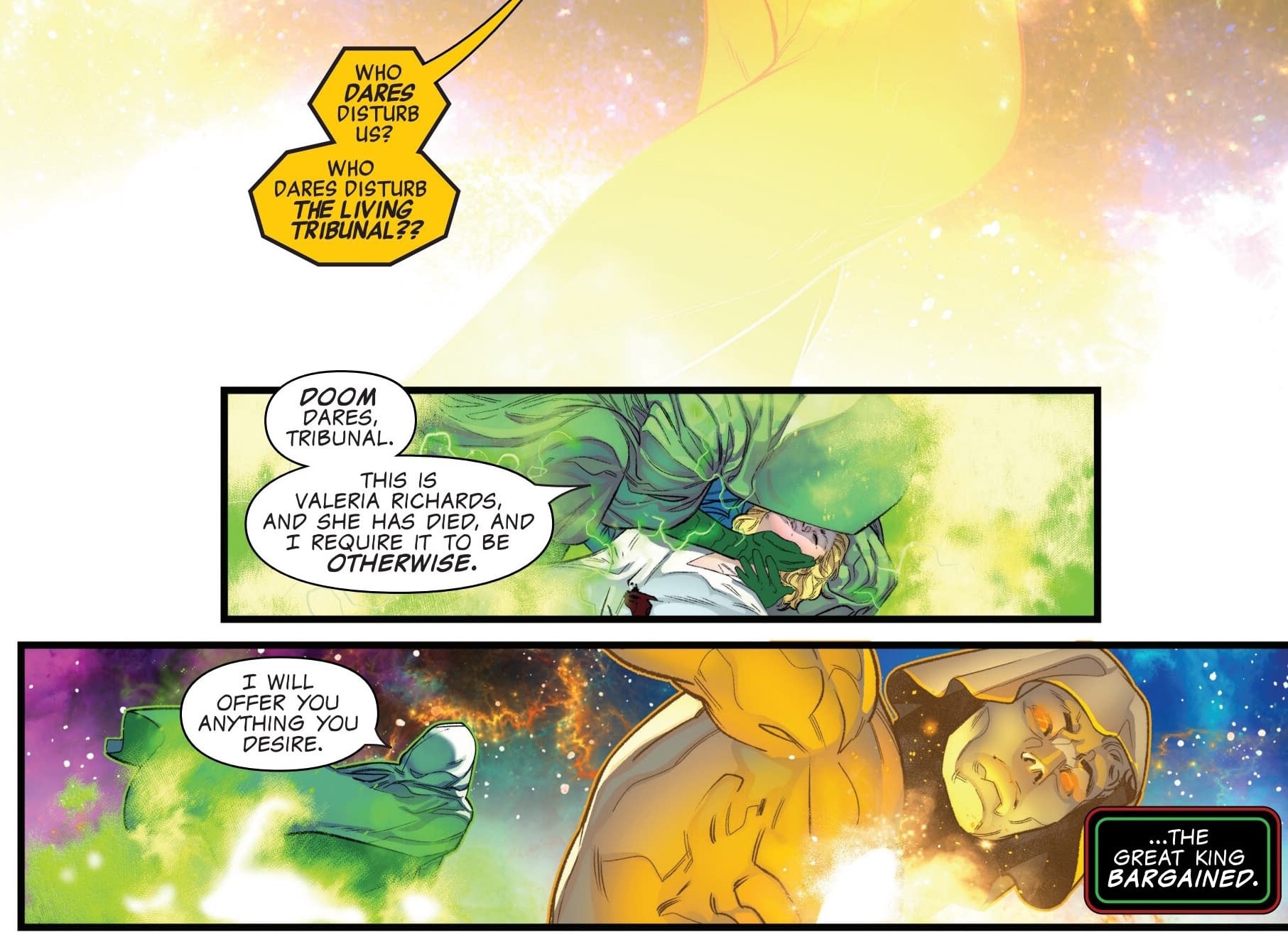 As Doctor Doom bargains with the very fundamental beings at the core of reality for her life to be restored. Willing to do whatever deal Peter Parker did for the life of his Aunt.