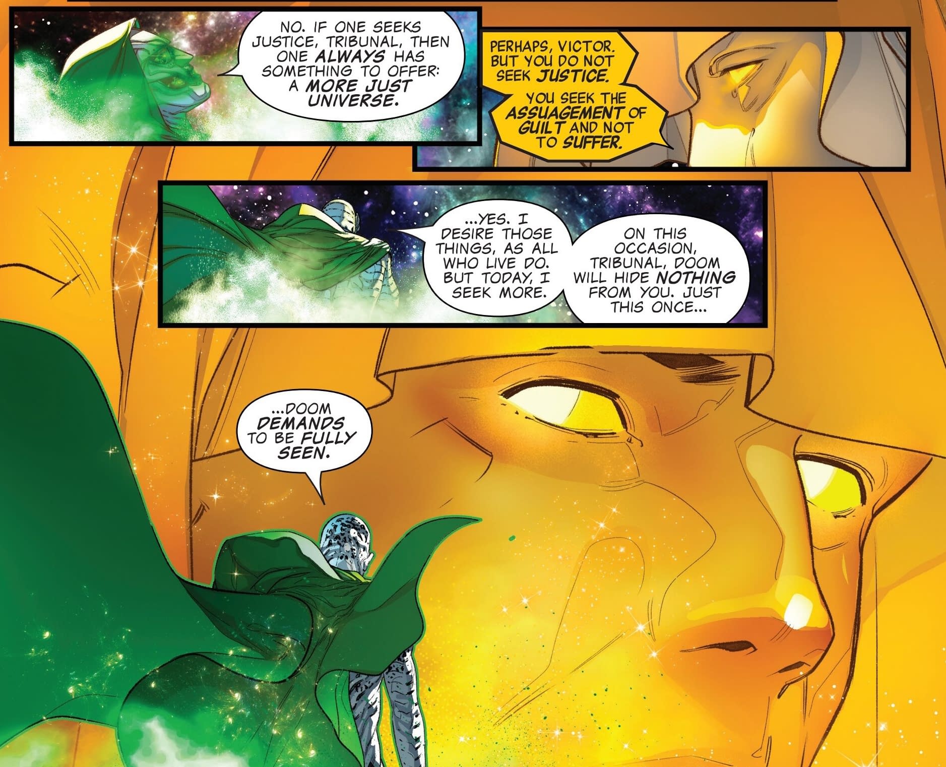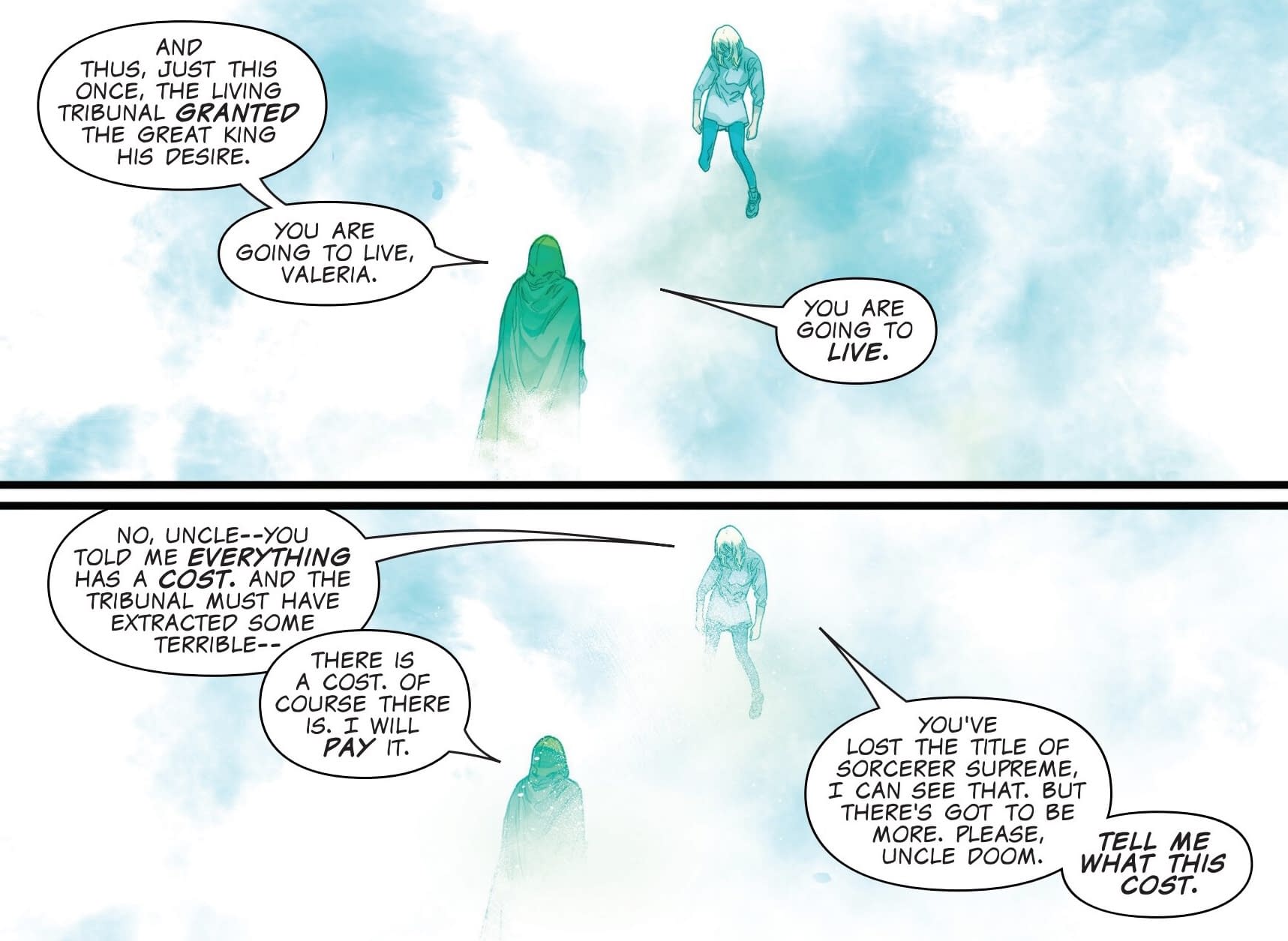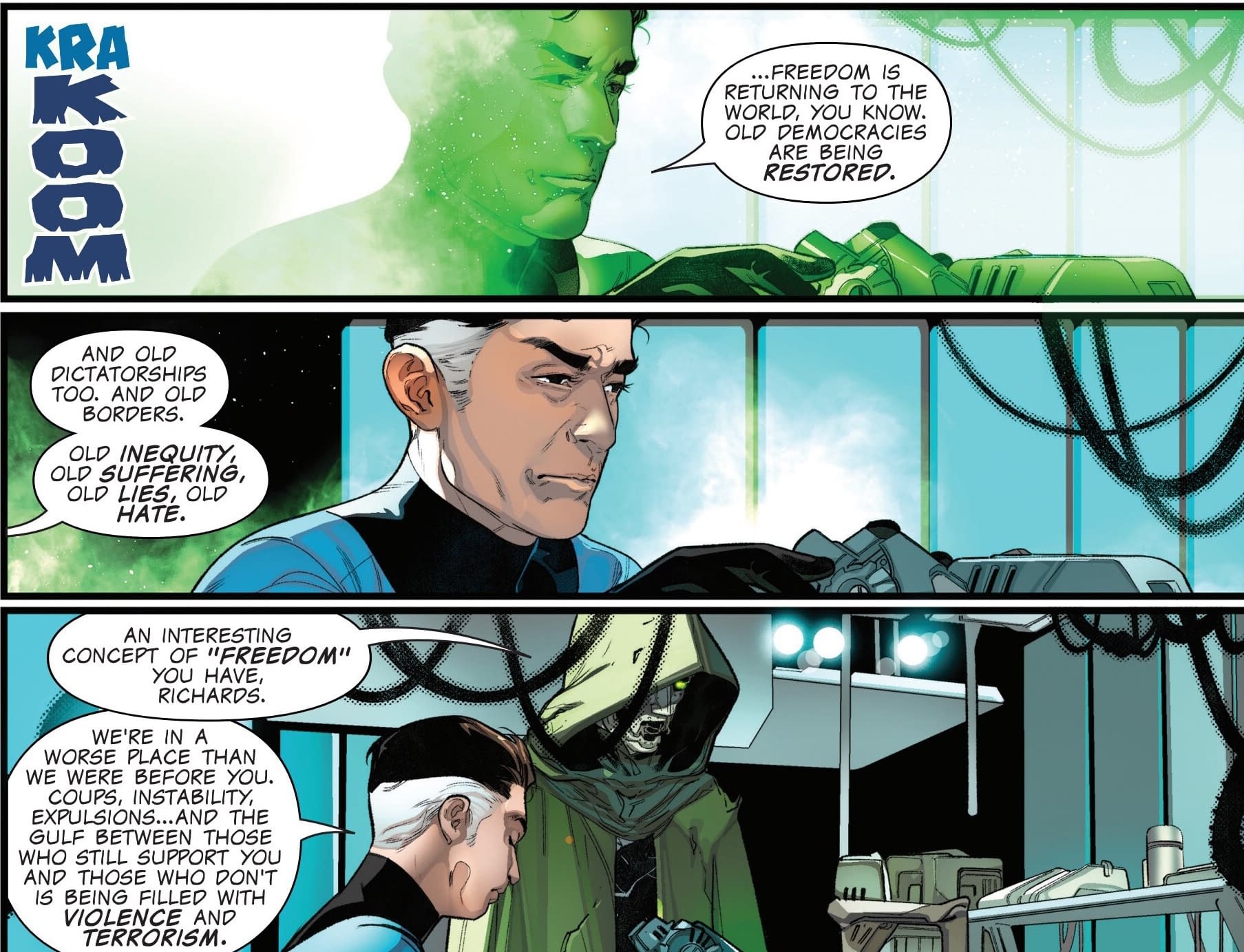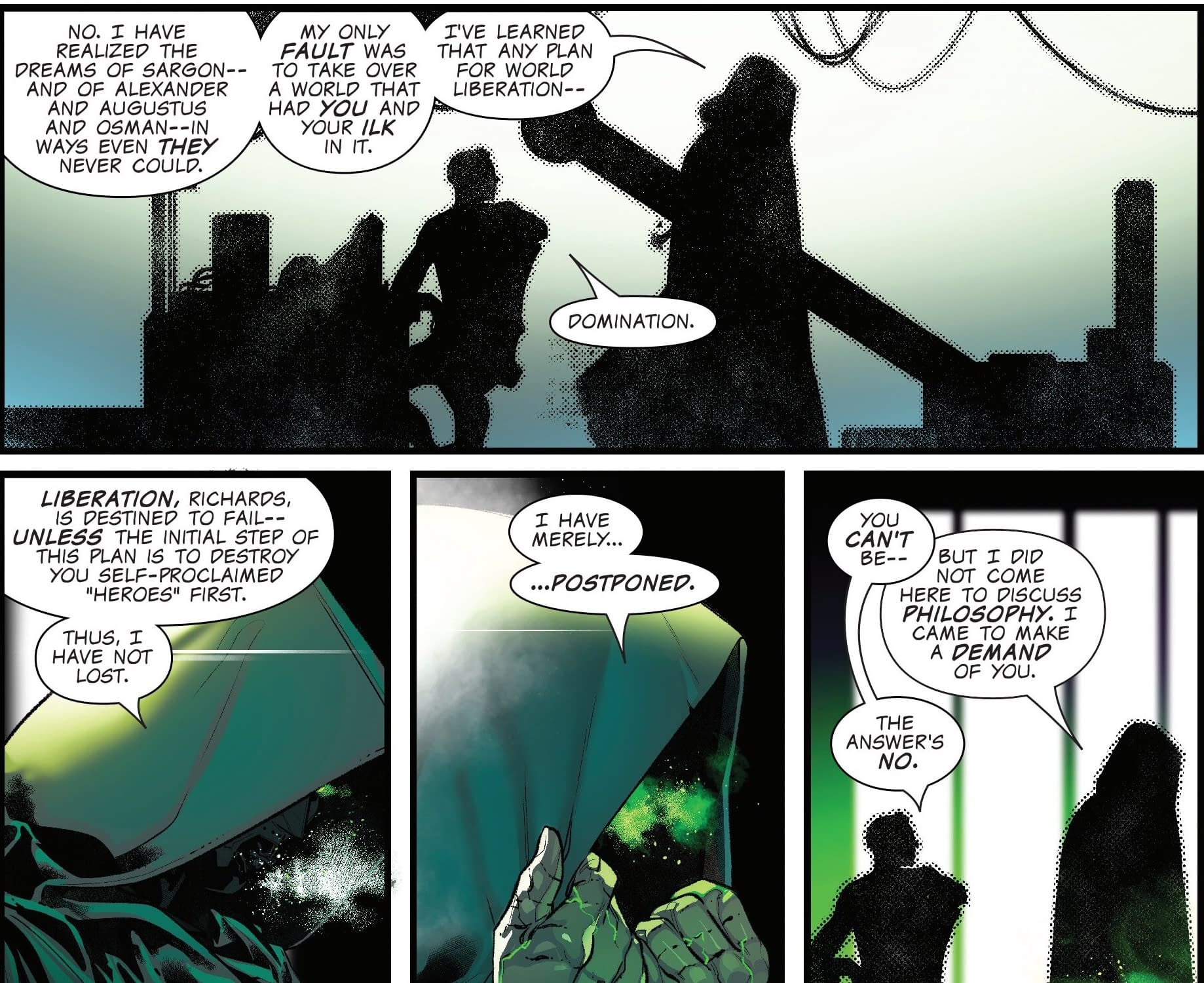 But there is a truth to be shared with Reed Richards in these last few seconds, revealing the price that was paid for Richards' own daughter's life and paid for by Doctor Doom.