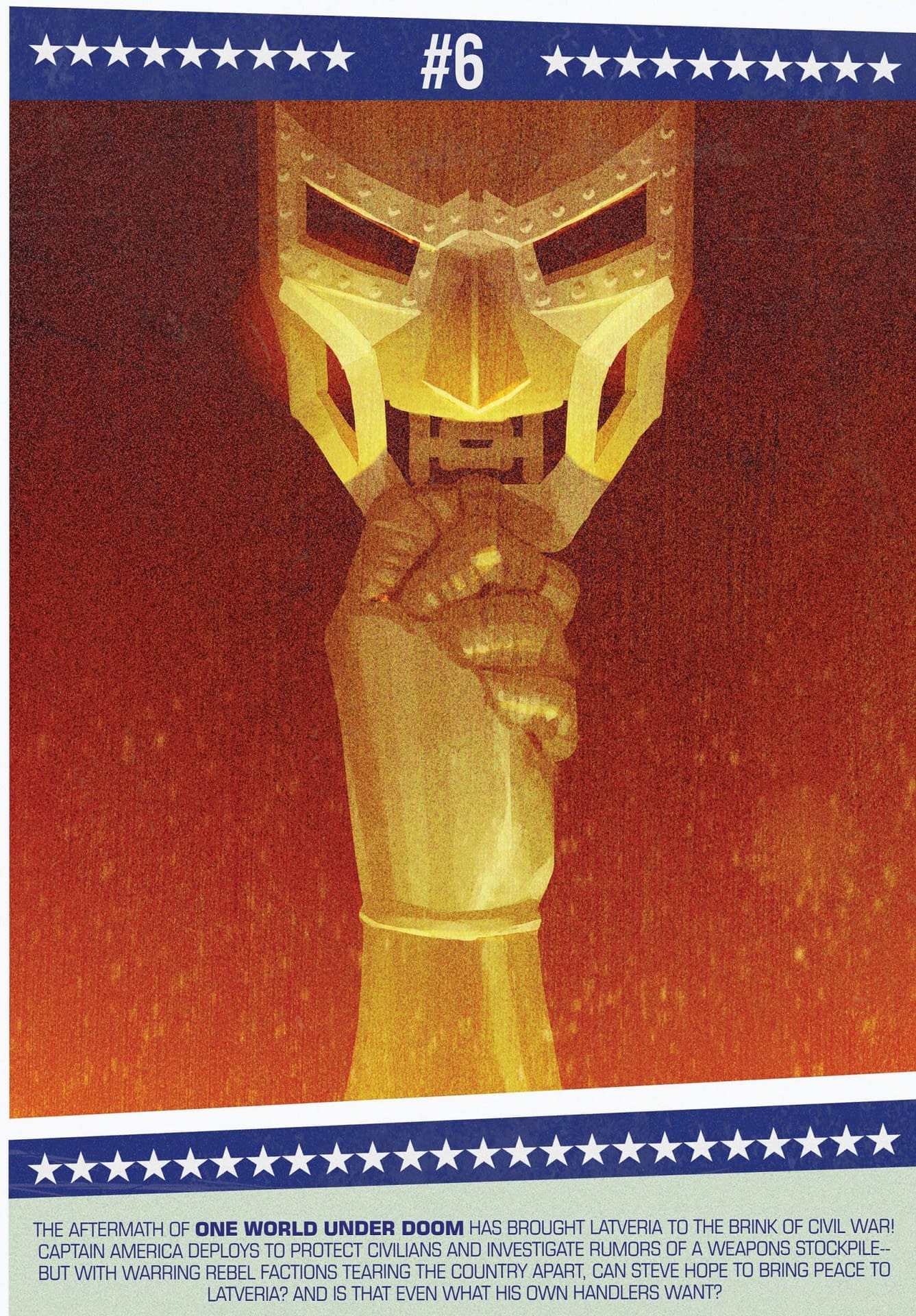 "Smaller, leaner, and more underground than its predecessor, the re-formed S.H.I.E.L.D. includes an eclectic group of agents: Joe Ramos, an altruistic soldier from Brooklyn; Charles Castlemore, a retired Marine with strong opinions about the Latverian resistance; Trevor Tambling, a soldier of fortune with unclear motives; and Red Widow, a former Russian agent abandoned by her home country for her questionable loyalty. Nick Fury must keep these soldiers in line as they carry out their secret task to retrieve Doom's weapons—even if it means clashing with Cap!