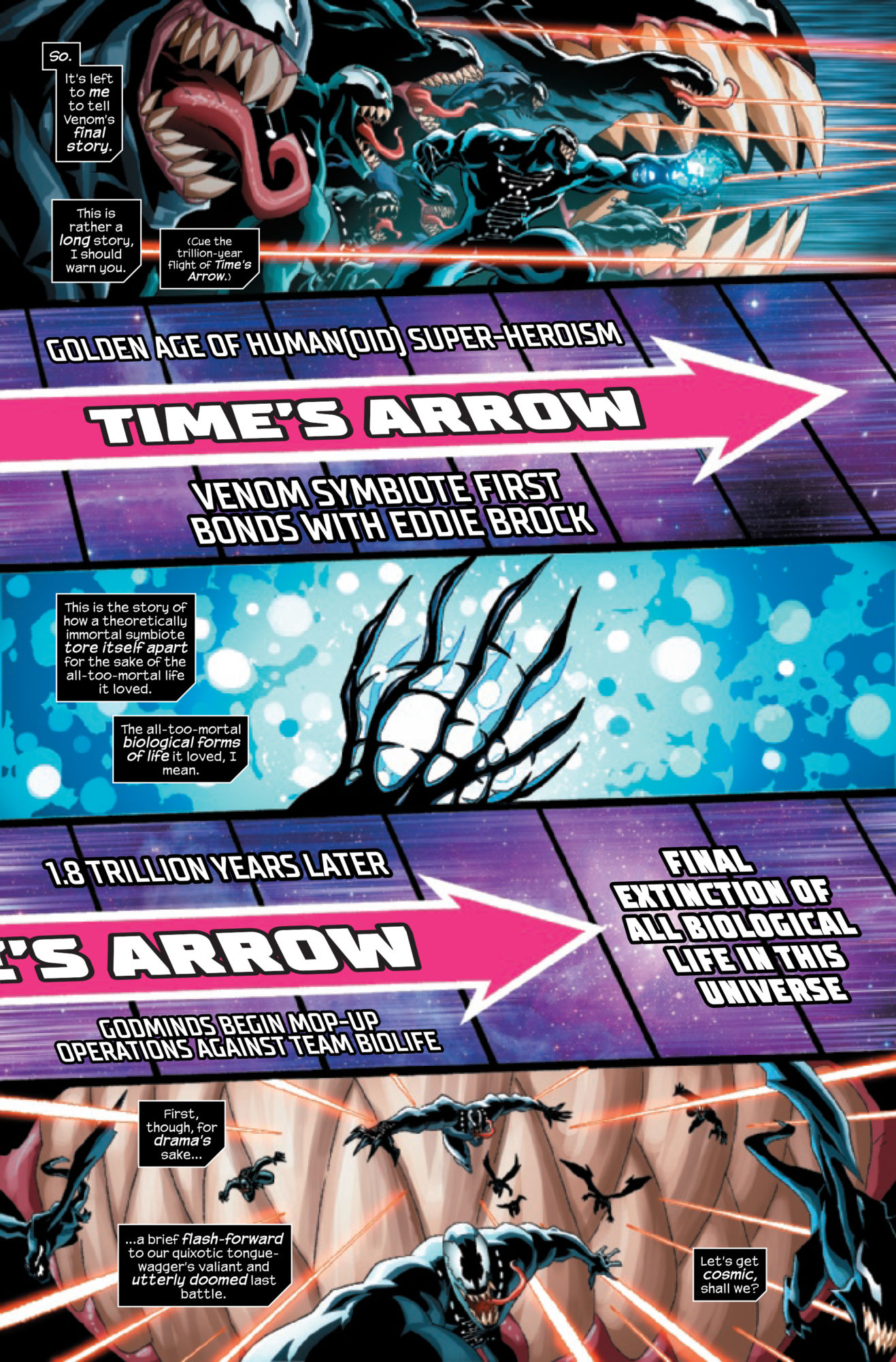 The alien symbiote who bonded with Eddie Brock has been through a lot… but not nearly as much as he has coming. In a tale that literally spans over a trillion years, Venom travels the length of space and time as the last defender of life in the universe!