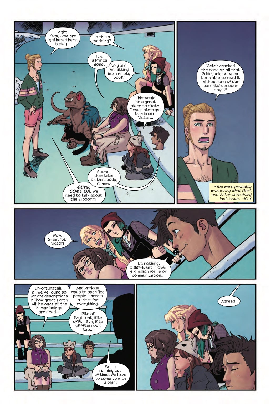 Things are looking pretty dire for the Runaways. First, their betraying ex-member Alex Wilder shows up looking to rejoin the group, and following close behind him are the children of the Gibborim, the evil space gods who the Runaways' evil parents worshipped. Worse, the Gibborim Kids demand the Runaways fulfill the human sacrifice promised by their parents in the Pride.