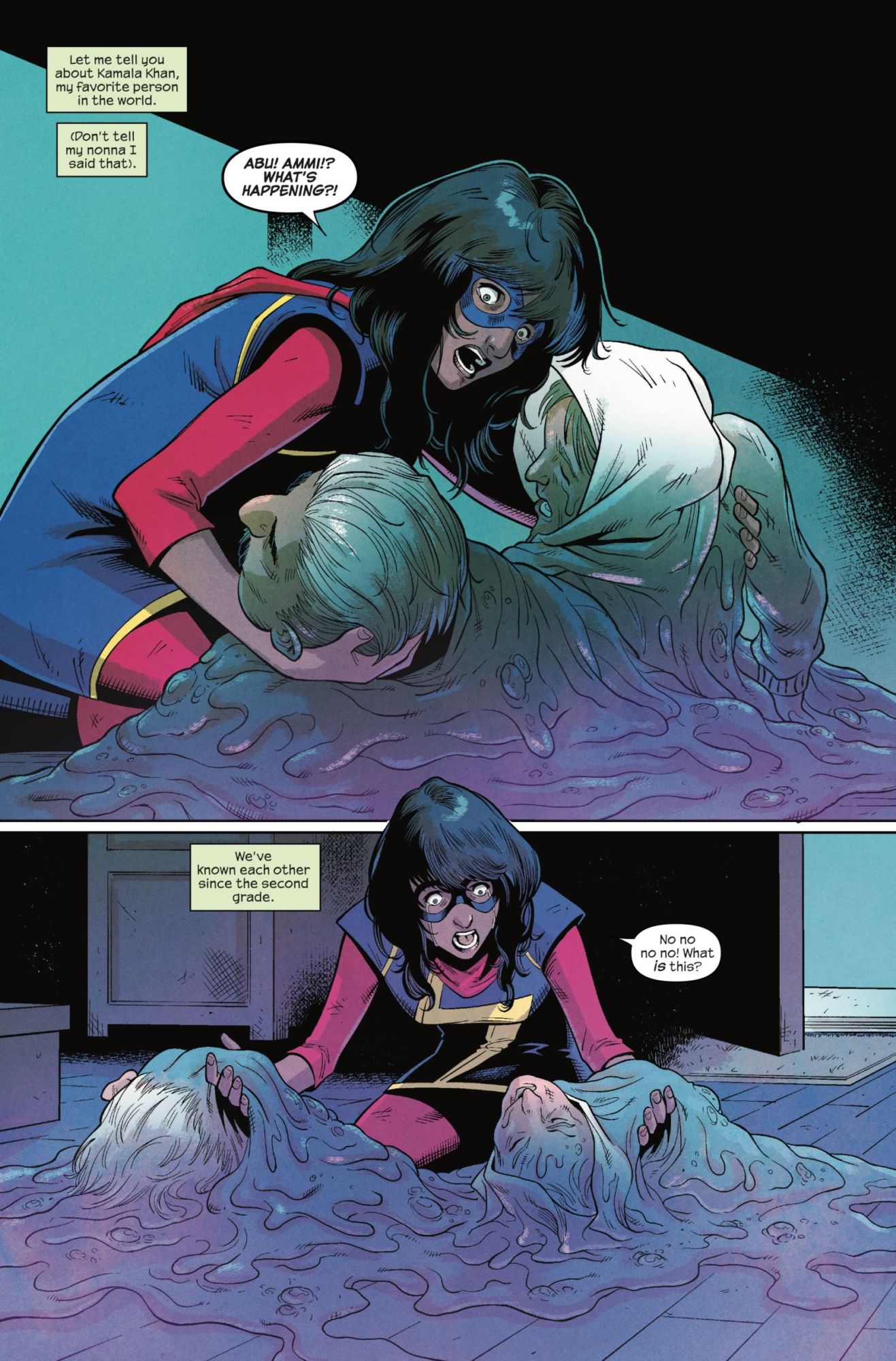 In The Magnificent Ms. Marvel #1, Kamala Khan was surprised to learn that her father had become aware of her secret identity as a teen superhero… and forbid her to continue. But perhaps all was not as it seemed? That issue ended with Kamala returning home after a long day of superheroing to be confronted by her parents once more and witness them melting into puddles of gray goo. That's where this week's preview of Magnificent Ms. Marvel #2 picks up…