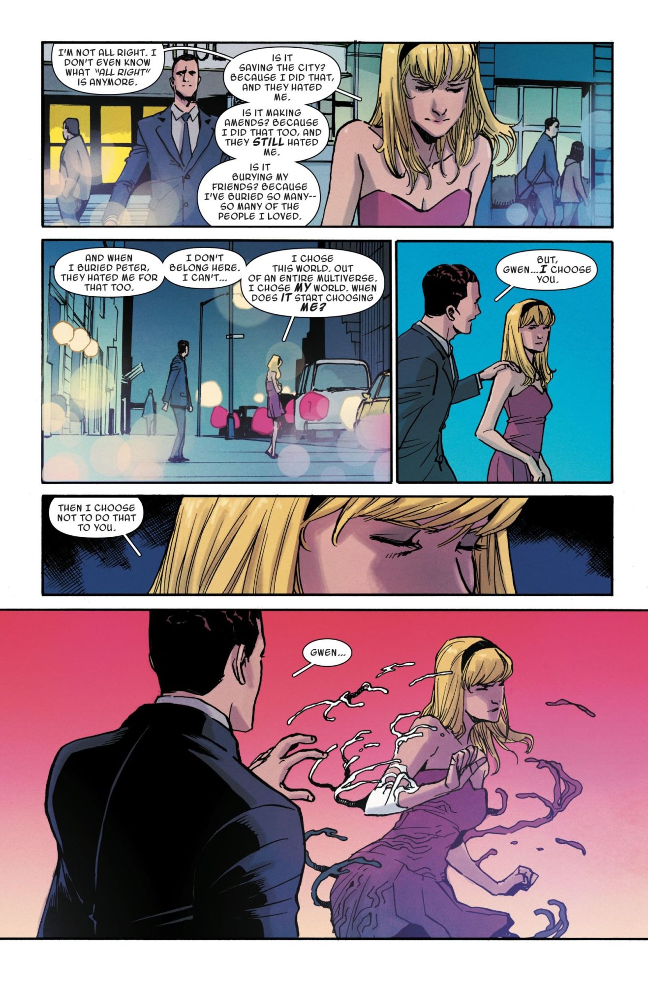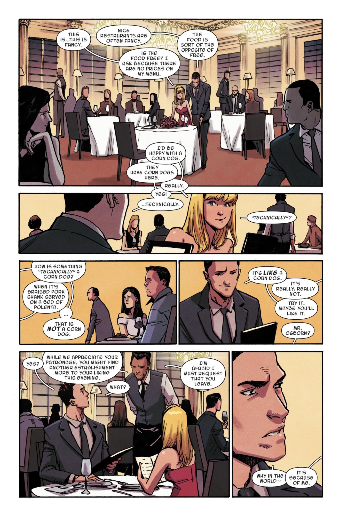 In next week's Spider-Gwen: Ghost Spider #7, Gwen has a date! With Harry Osborn! And they're going to a fancy restaurant, even if it, it seems, Gwen would prefer to just grab a corn dog . Watch the romance unfold in this excerpt of the preview below…