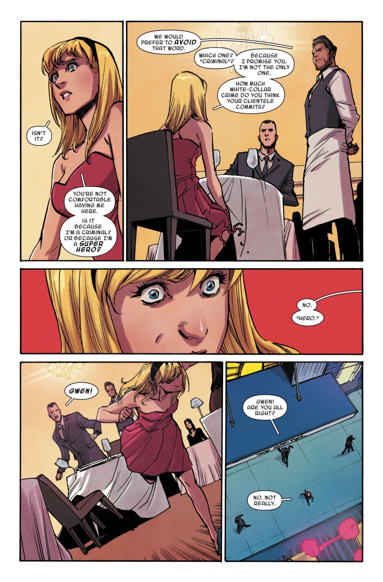 Actually, it seems it isn't Gwen's preference for meat on a stick that has made her unwelcome in this establishment. This is a restaurant that doesn't want to serve… superheroes?!