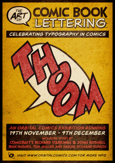 The Art of Comic Book Lettering – Orbital Comics, until the 9th December. Running from November 19th to December 9th, this very special exhibit features contributions from Comicraft's John Roshell & Richard Starkings, Rian Hughes, Tom Muller and Hassan Otswane-Elhaou, as well as written articles chronicling the origins of the comic book font.