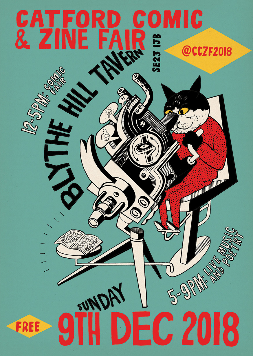 The Catford Comic and Zine Fair with added live music and poetry. With Darren Cullen, Jade King, Tom Mortimer, King Louie's Lab, Nick White, Ben Williams, Decadence, Lucy Sullivan, Emilia Mckenzie, David Biskup, Joe Decie, Gareth Hopkins, Dave Turbitt, Douglas Noble, Wallis Eates, Nicolas Burrows, Kim Clements, Sean Azzopardi, John Riordan, Hanna Lee Miller, Elizabeth Quertstret, Tim Bird, Hattiecomics, Joe Stone, Olivia Sullivan and Gareth Brookes.
