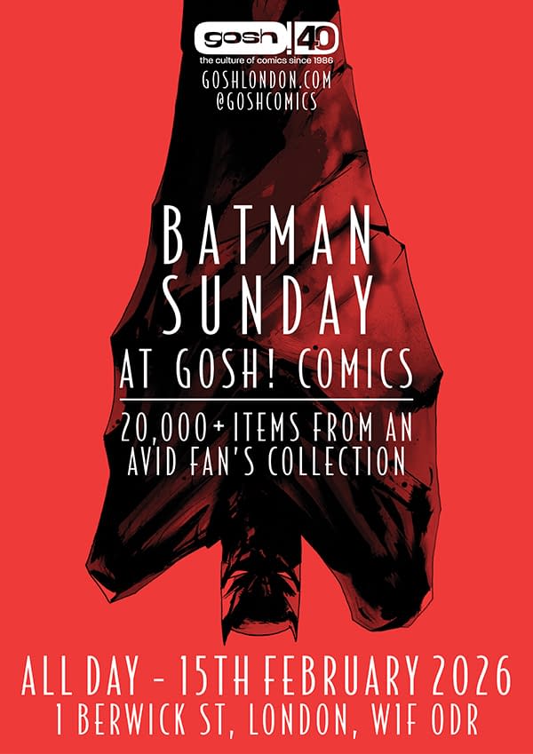 "Gotham City is coming to Soho! On Sunday 15th February 2026, Batman will be taking over Gosh! Comics. We'll have an enormous trove of Batman goodies from the collection of one the Dark Knight's greatest fans. This collection is truly mind-blowing and must be seen to be believed. See it for yourself, ALL DAY, on Sunday 15th February. Our dedicated staff have spent the last few weeks organising and pricing this mammoth Bat-stash, which will be taking over the shop on Batman Sunday. There's early Detective Comics showcasing the caped crusader's formative years, awesome toys such as collectible statues or iconic lego figurines, and other peculiar oddities such as Batarangs, vintage magazines and rare video games. We were being conservative with our 20,000 item estimate, this collection is truly staggering, with over 100 boxes of comics alone. This is a must visit day for any Batman fan or collector. We'll see you on Sunday 15th February 2026, starting from when we open at 10.30am. This will only be available in store and items will not be going online. We will not be able to reserve any items so make sure to save this date in your Bat-diaries."