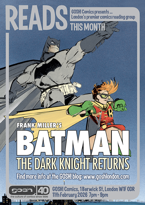 - Reads February, monthly comics reading group at Gosh Comics, Berwick St, Soho, 7-9pm, Frank Miller's Batman: The Dark Knight Returns."If you don't already know, we've been running a comics reading group for some time now. Once a month on a Wednesday evening, the shop closes its doors and welcomes the reading group in for an evening discussion of one of our favourite comic books. Reads is free to attend and welcome to all! You simply need to turn up on the night. The reading group are a friendly bunch and always welcome new members. This Reads is particularly special since we'll be celebrating our 40th birthday over the following weekend. The first issue of The Dark Knight Retuns miniseries released during this week 40 years ago too and it's no coincidence that we chose this as our reading pick of the month, being one of the very first comics on our shelves when we opened in 1986. Not to mention it's an astounding comic and one of the all time best superhero titles! We look forward to seeing you on Wednesday 11th February, from 7pm, and hope to see some new faces! You can order a copy of The Dark Knight Returns from our website by clicking the link here."