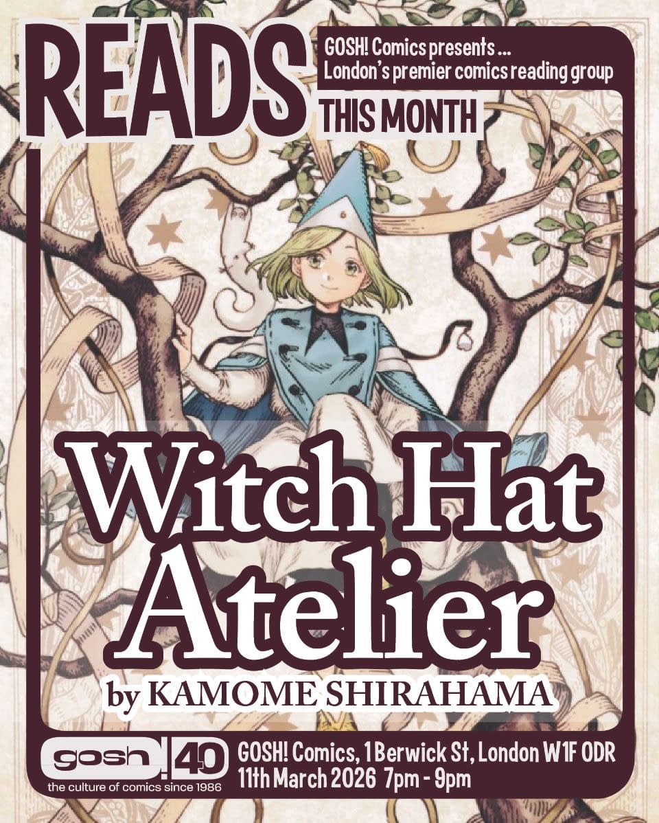 Volume 1 of Witch Hat Atelier. Gosh online discount code: READSMAR26. "If you don't already know, we've been running a comics reading group for some time now. Once a month on a Wednesday evening, the shop closes its doors and welcomes the reading group in for an evening discussion of one of our favourite comic books. Reads is free to attend and welcome to all! You simply need to turn up on the night. The reading group are a friendly bunch and always welcome new members."