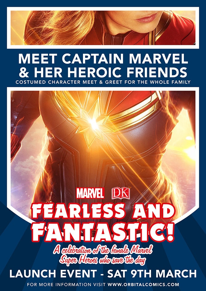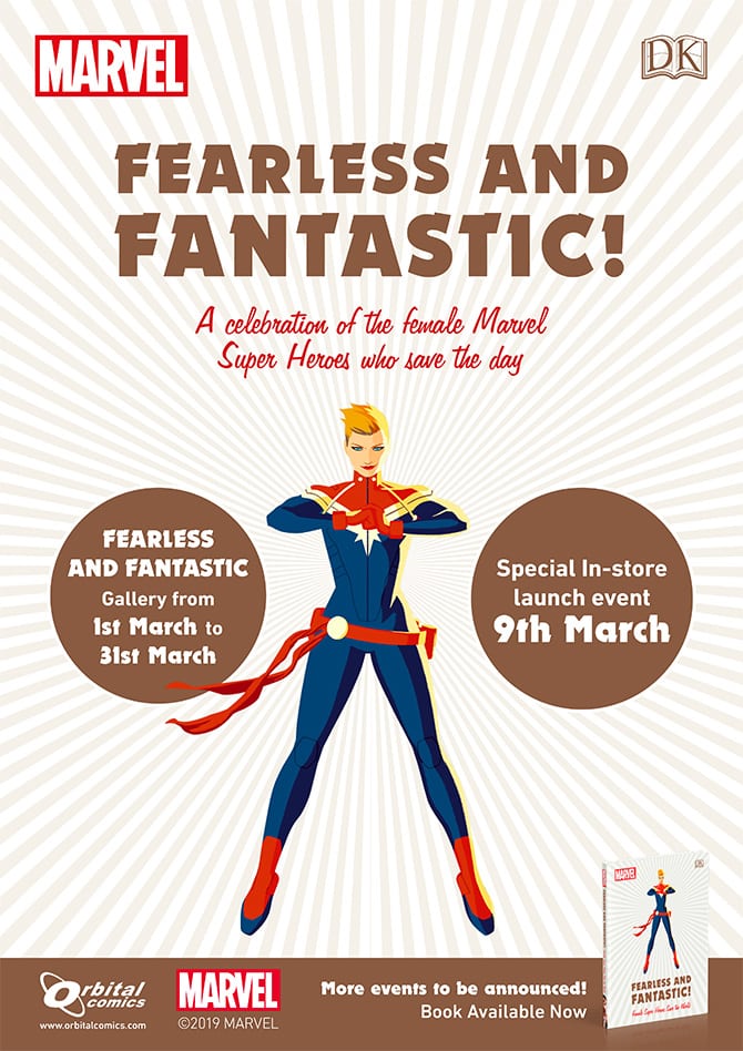 Fearless And Fantastic Exhibition, until 31st March. Orbital Comics. In celebration of International Women's Day, Orbital Comics and DK Books are proud to host an exhibition of pages from DK's latest title "Fearless and Fantastic!" — a who's-who of female Marvel superhero character profiles. This fantastic exhibit runs for the entirety of March, but for the full experience, come on down Saturday 9th March to meet Captain Marvel, Black Widow, Ms Marvel and other costumed super-women of the Marvel Universe in person.. Copies of Fearless and Fantastic will be available in store, as well as a wealth of Marvel's greatest female-led graphic novels!