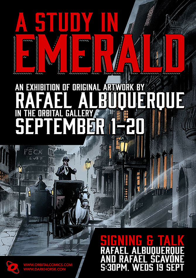 A Study in Emerald at Orbital Comics. Adapted from a Neil Gaiman story, with art by the Eisner-winning Rafael Albuquerque, a gothic horror that echoes both Sherlock Holmes and the Cthulhu mythos of H.P. Lovecraft. A collection of original pages from this graphic novel will be on display in the Orbital Gallery. September 1st – 20th.