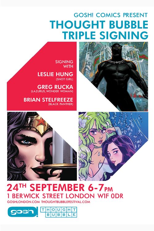 Thought Bubble Triple, Gosh Comics, 6pm. Leslie Hung, Greg Rucka, and Brian Stelfreeze signing.