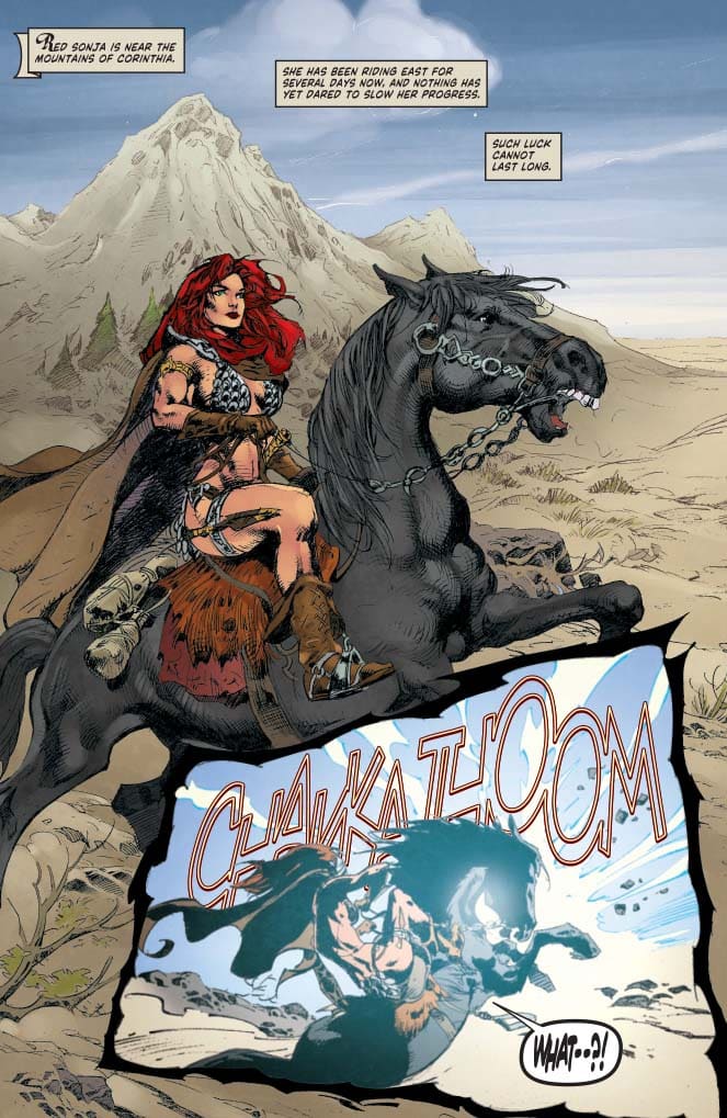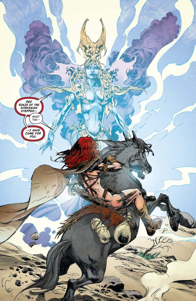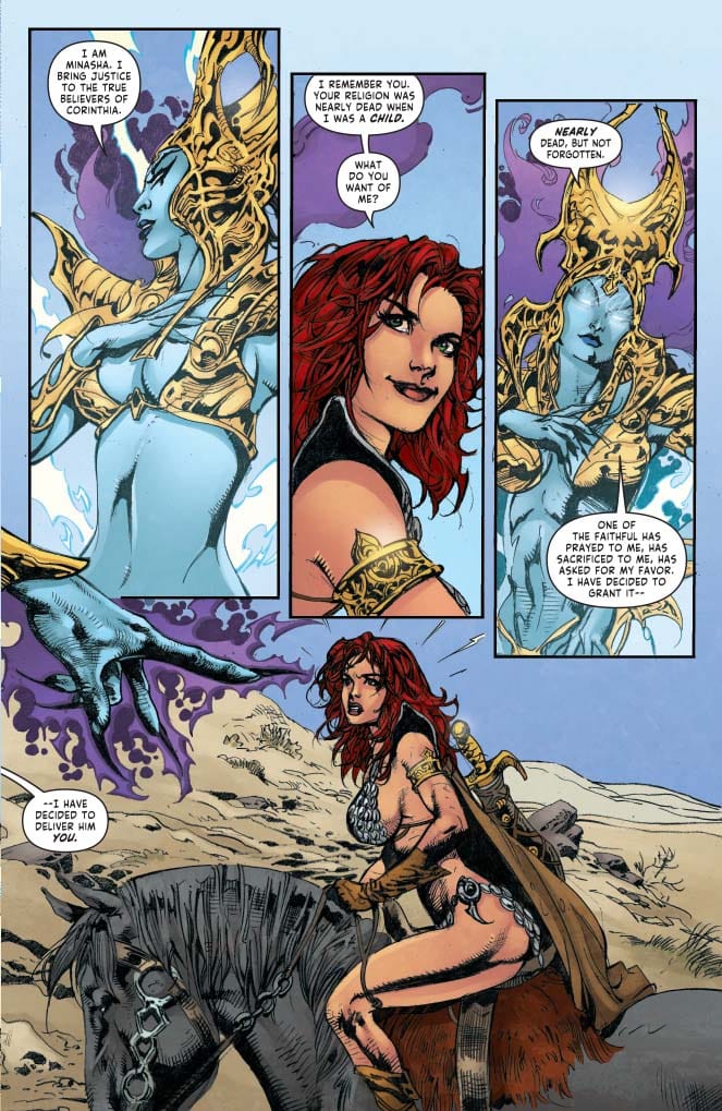 In the issue, hitting stores on Wednesday, the titular Sonja is confronted by Minasha, goddess of a mostly forgotten religion. Minasha has at least one devoted follower, one who has prayed to her to deliver Red Sonja, who slew one of his sons in battle.