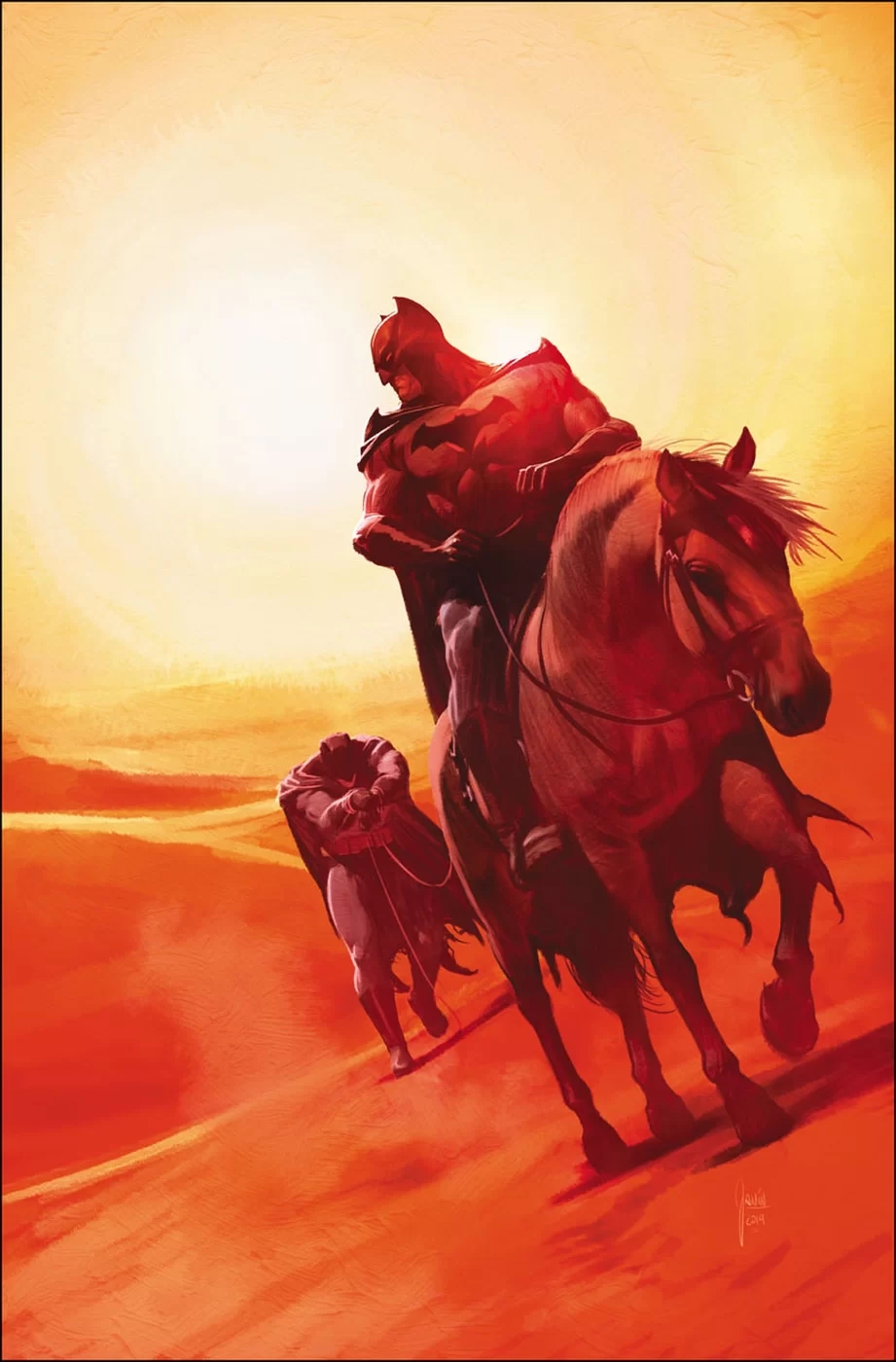 This is how Batman #70 was solicited, beginning the Fall And The Fallen storyline by Tom King and Mikel Janin, leading into The City Of Bane by Tom King and Tony Daniel. With this cover showing one Batman dragging another along through the desert under a beating sun.
