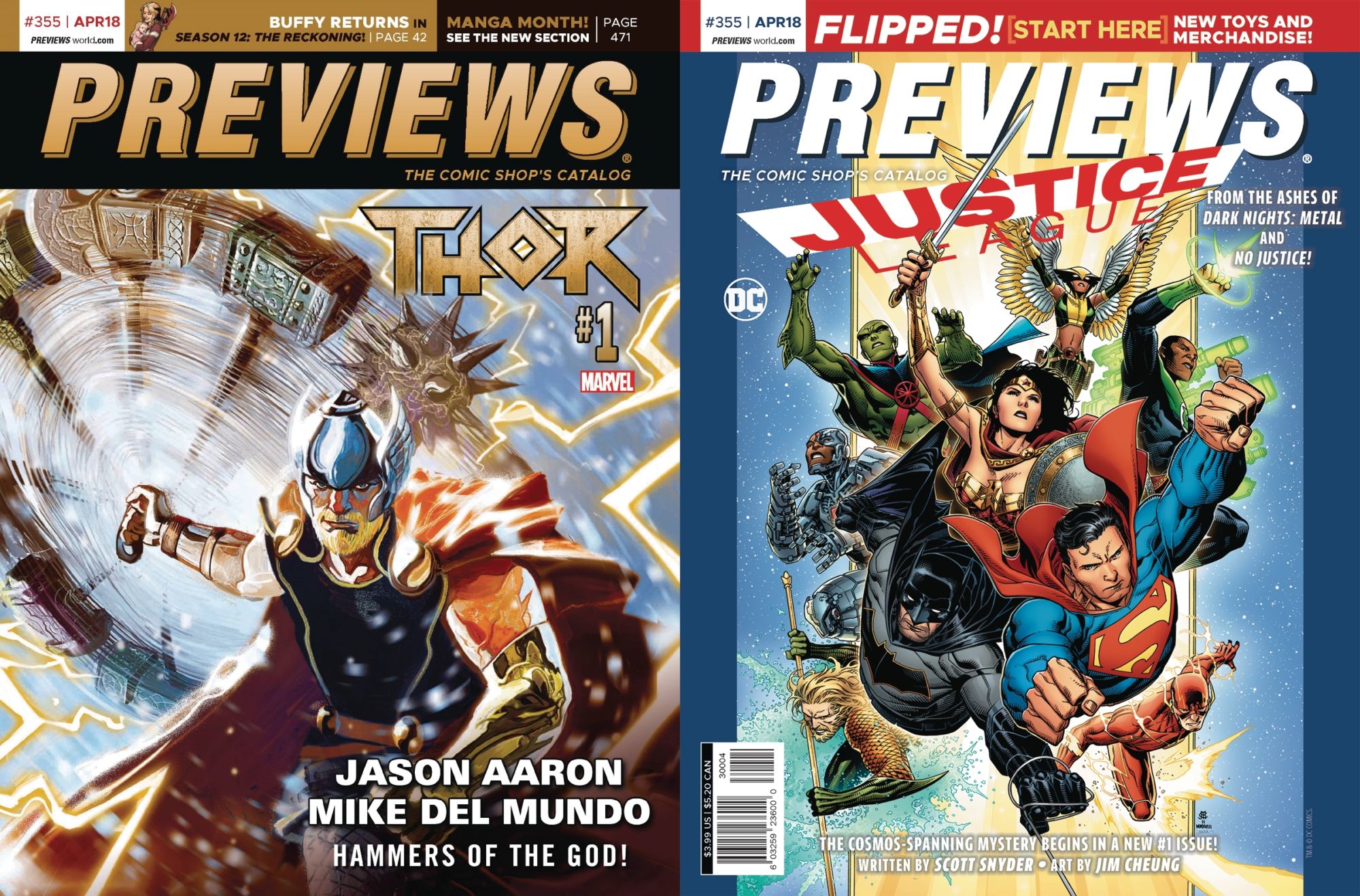 The upcoming April Previews catalogue from Diamond Comic Distributors, for comics shipping in June, features the new Thor #1 by Jason Aaron and Mike Del Mundo on its front cover and the new Justice League #1 by Scott Snyder and Jim Cheung on its back, though both series launch with two issues in June.