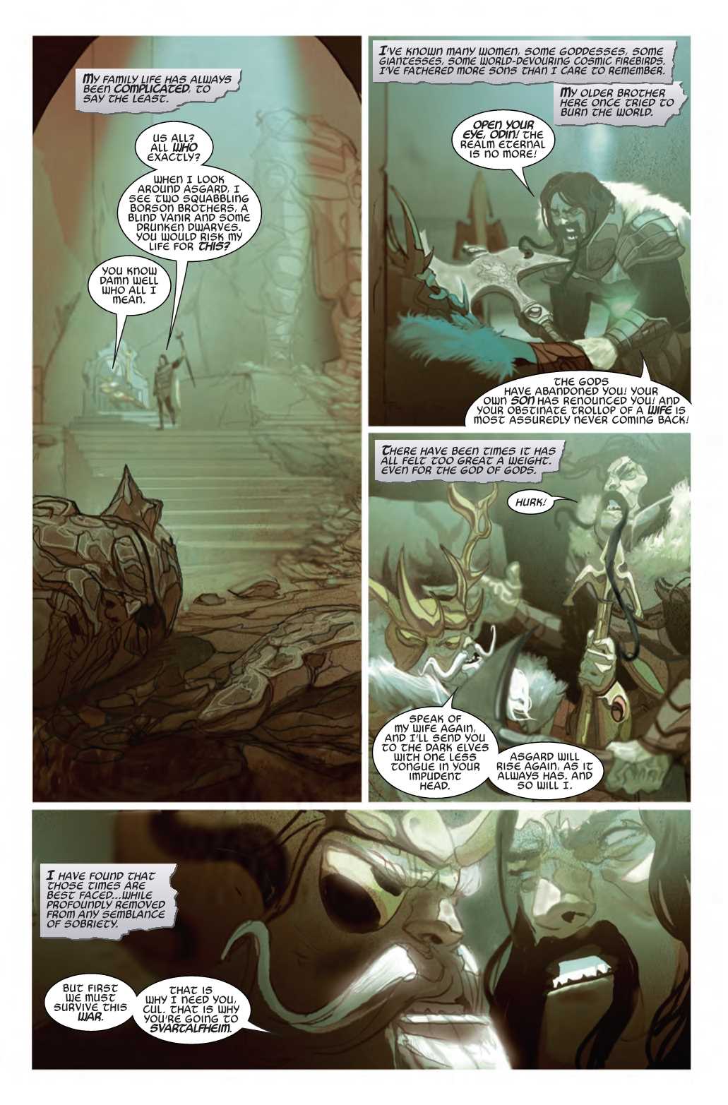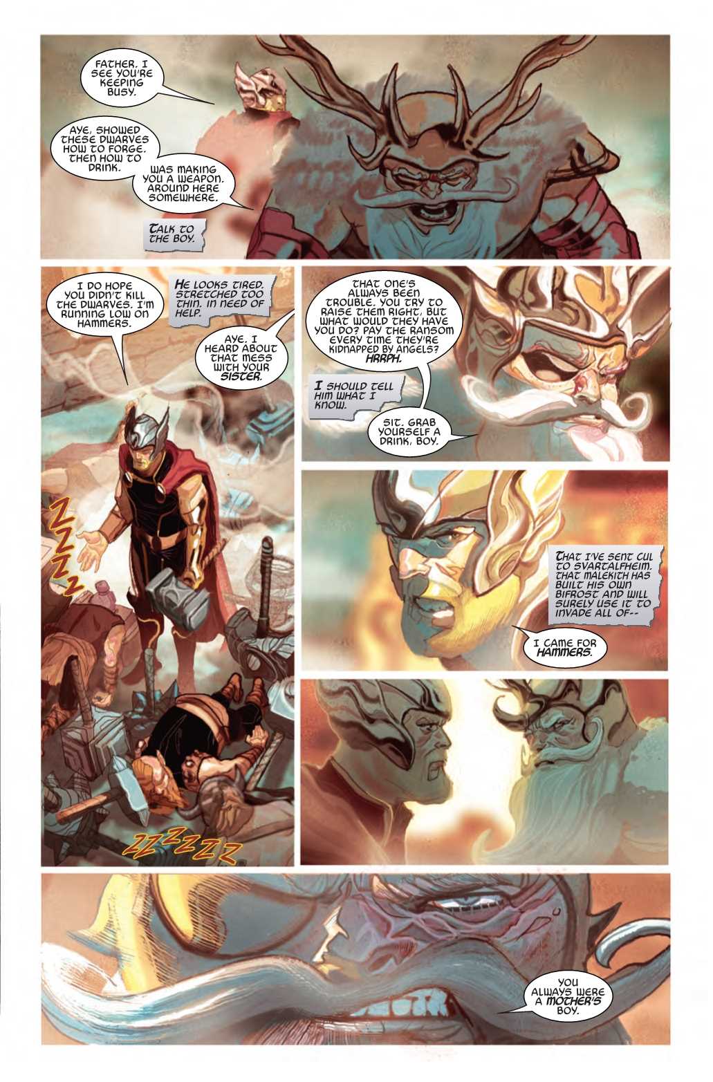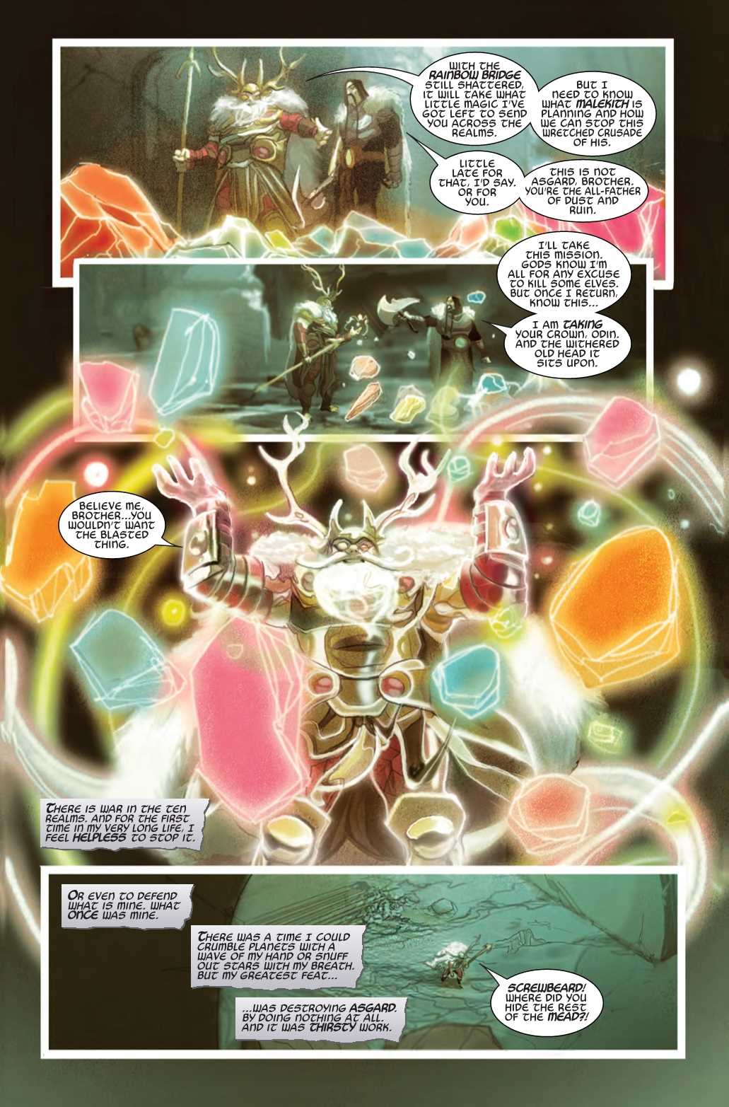 For months, the realms have burned with the flames of Malekith's war, while Almighty Odin did nothing. Now Asgardia is lost in the sun, the Rainbow Bridge is shattered and the All-Father sits alone in the empty ruins of Old Asgard, drunk on mead and despair. If Odin is going to save what's left of the realms, he'll have to undertake the most difficult labor of his very long life. Not by being the omnipotent All-Father, but by finally being just a father to the mighty Thor.