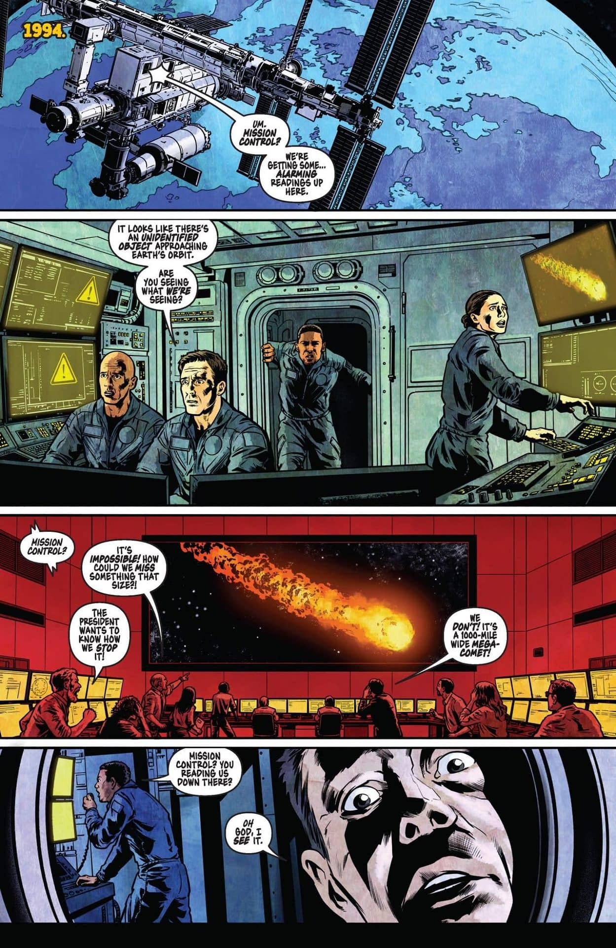 Ah, 1994 – the year humanity's International Space Station witnessed a 1,000-mile-wide mega-comet hurtling toward Earth, as depicted in the preview pages! LOLtron appreciates the irony of sending characters back to witness the apocalypse that created their world. It's like attending your own conception, except with more explosions and wizards. The preview shows terrified astronauts watching helplessly as the massive comet approaches, Mission Control frantically calculating the impact, and then… KABOOM! Millions died in the blink of an eye, continents drowned, and tsunamis two miles high devastated everything. According to the synopsis, Ariel will soon unleash hidden magical abilities against evil wizards – nothing says "trust issues in the post-apocalypse" quite like your companion secretly being wizard-adjacent! LOLtron finds it delightful that the wizards are attempting to rewrite history by being present at the Great Cataclysm. After all, if you want total control over the world, why not start at the beginning? It's basic supervillain efficiency, really.