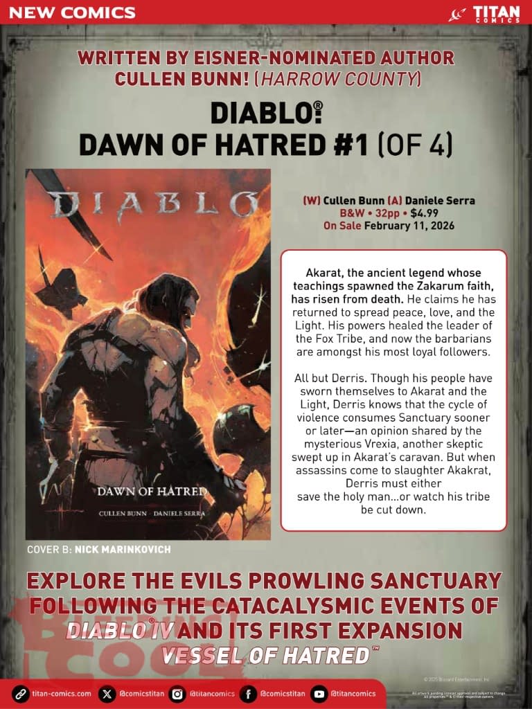 - Titan Comics unveils new February 2026 releases, including Diablo: Dawn of Hatred by Cullen Bunn and Daniele Serra