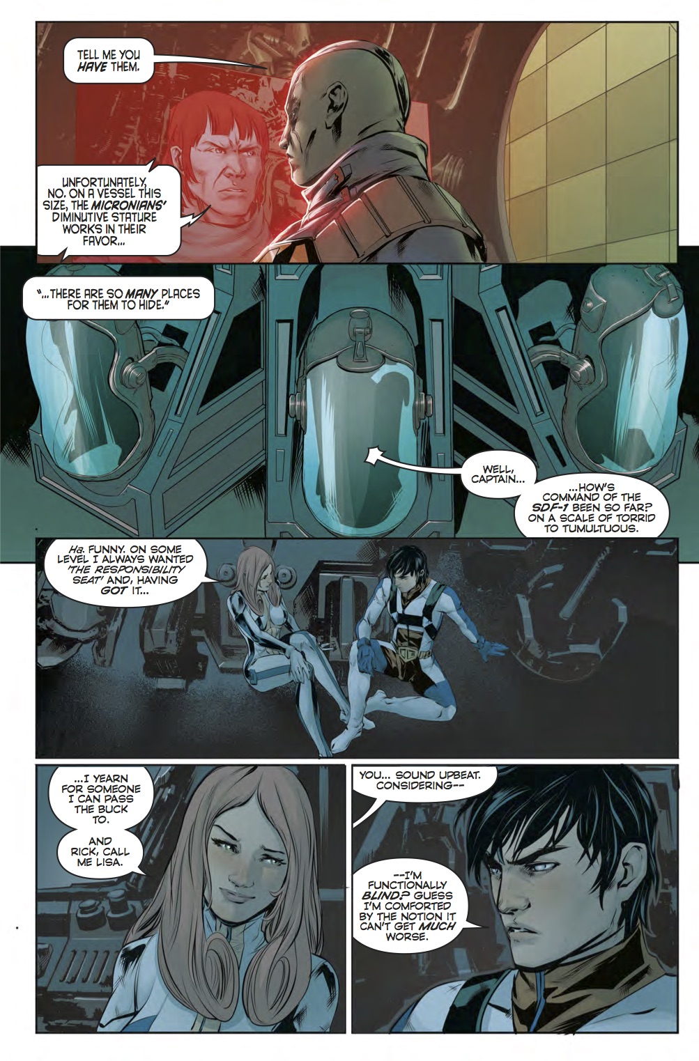 Meanwhile, the Vermillion Squad – Rick (now blind), Max and Ben – plus Lisa and Kramer have been taken prisoner aboard the Zentraedi flagship and interrogated by the aliens. In his Veritech, Max survived being brutally beaten by the Zentraedi Miriya and made his way back to free his friends…