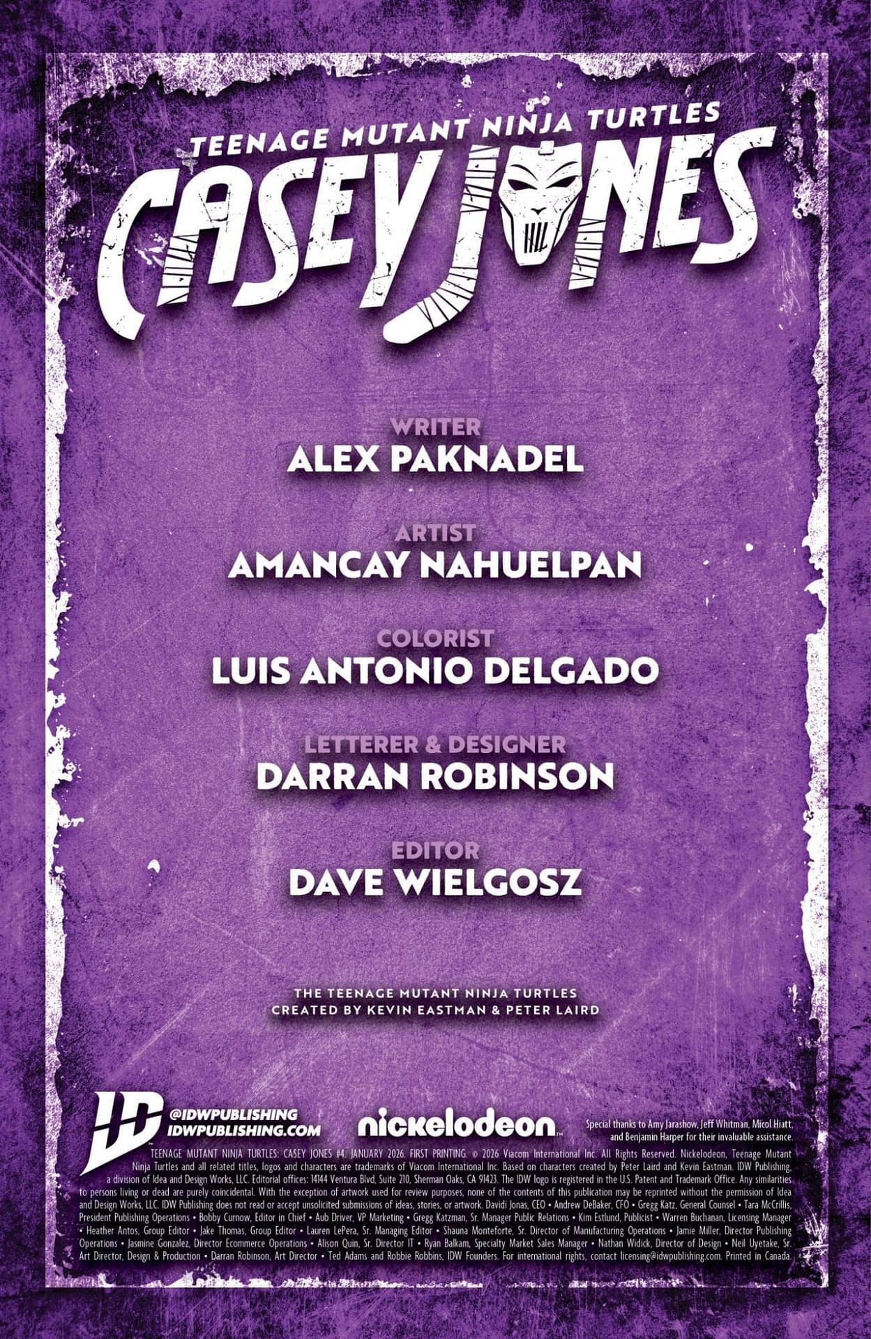 - Cover image for 82771403463900411 TEENAGE MUTANT NINJA TURTLES: CASEY JONES #4 AMANCAY NAHUELPAN COVER, by Alex Paknadel & Amancay Nahuelpan & Amancay Nahuelpan, in stores Wednesday, January 28, 2026 from IDW Publishing