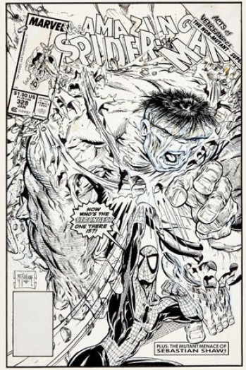 Todd talked about the recent auction of the cover art for Amazing Spider-Man #328 selling for $660,000 as being funny because he'd exchanged that artwork with the seller for some baseball cards (which he'd also done for the Spider-Man #1 cover) he didn't seem overly bothered by this. But he did go on to explain that he was disappointed in the literal coverup that happened in the image on that cover (below), which was actually Spidey punching the Hulk in the nuts, not (as is accepted) in the gut. It was, of course, a pretty ballsy move.