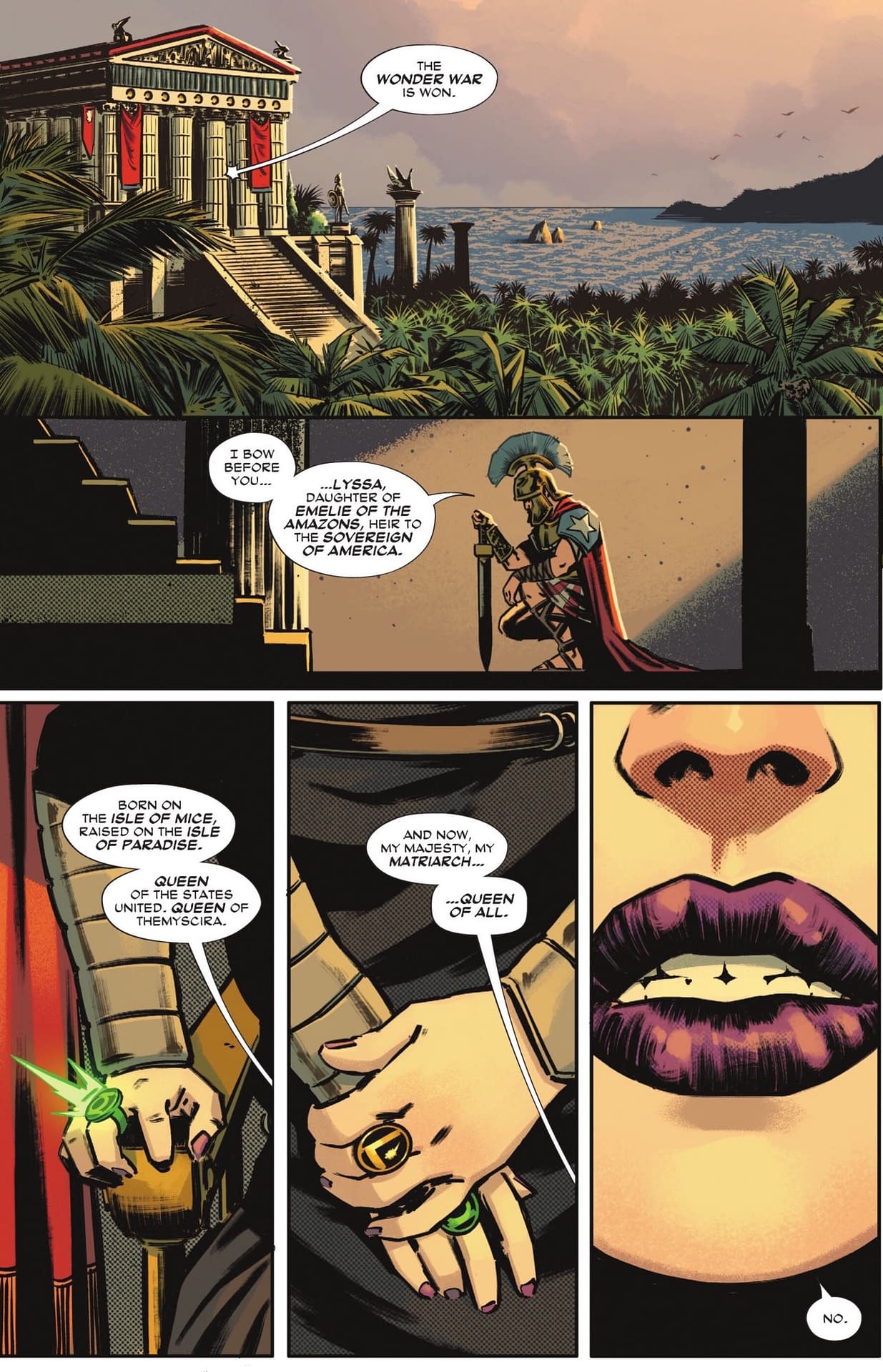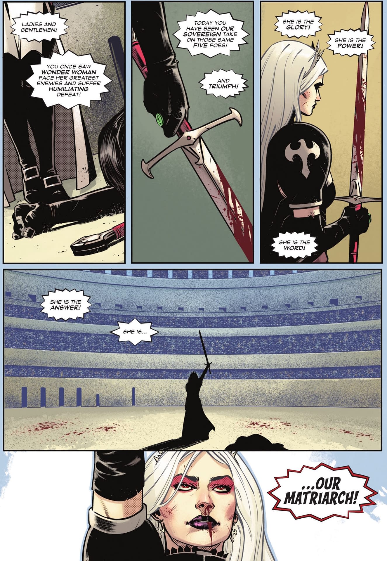 We kinda knew it. All the evidence was there. However, Tom King has confirmed that The Matriarch is Lyssa, the daughter of Amazonian warrior Emelie and the secret king of the USA, the real power behind – and on – the throne, The Sovereign, as part of his upcoming Wonder War arc in Wonder Woman with Daniel Sampere.