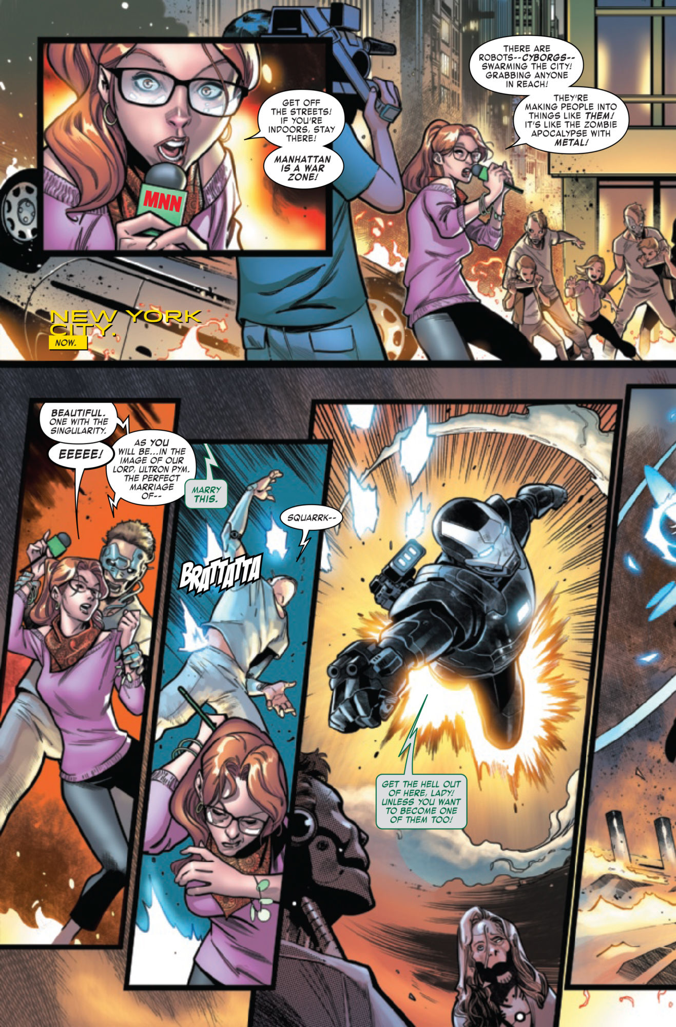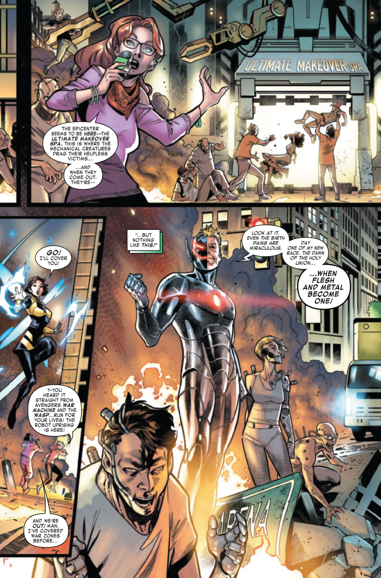 As we find excited citizens rushing to the streets when they learn that Ultron is giving out free cybernetic upgrades.