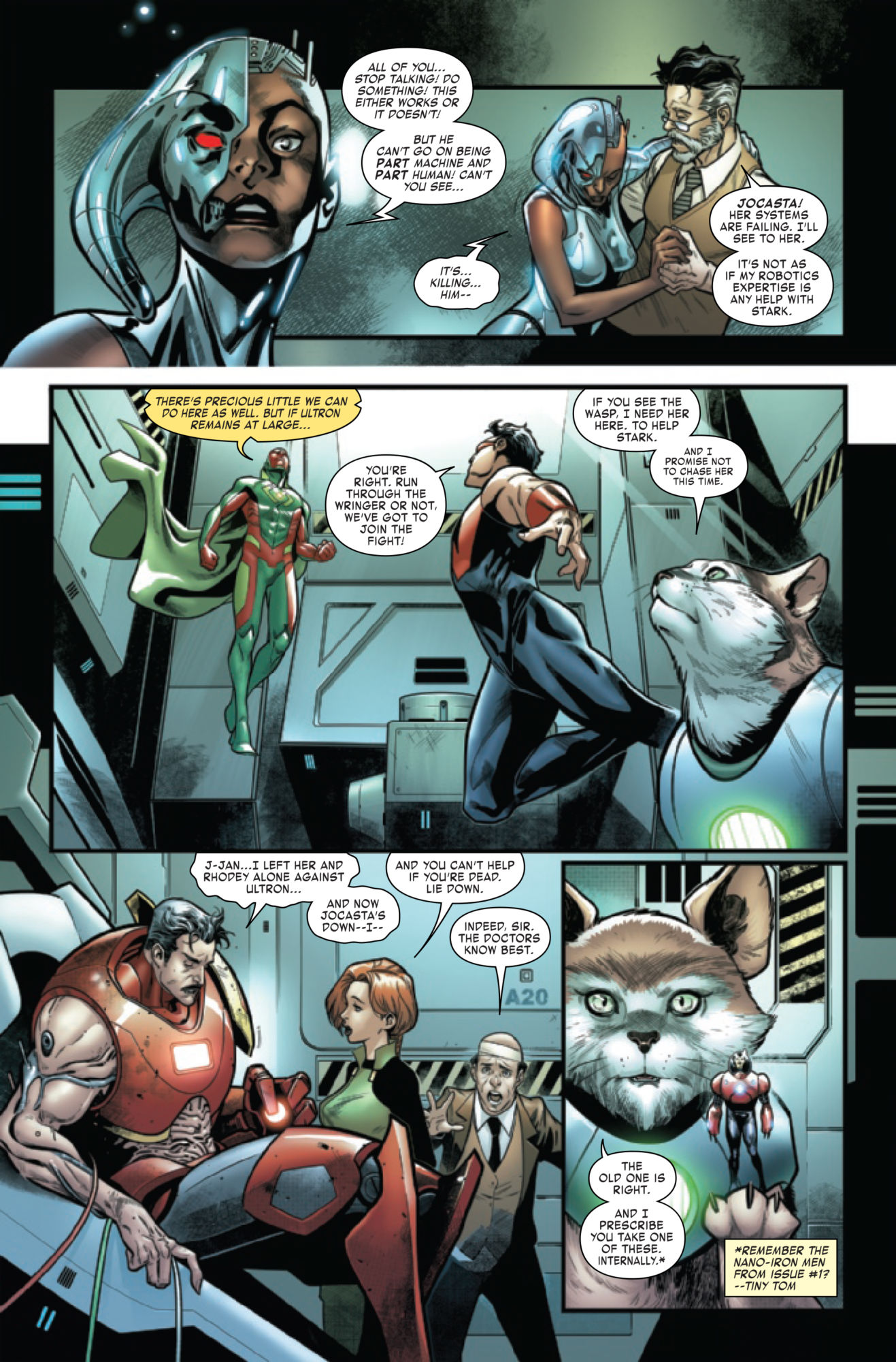 …a literal war rages on INSIDE Tony Stark! It's the Wasp and a remote piloted Nano Iron Man versus a shrunken Ultron/Pym inside Tony's physical body!