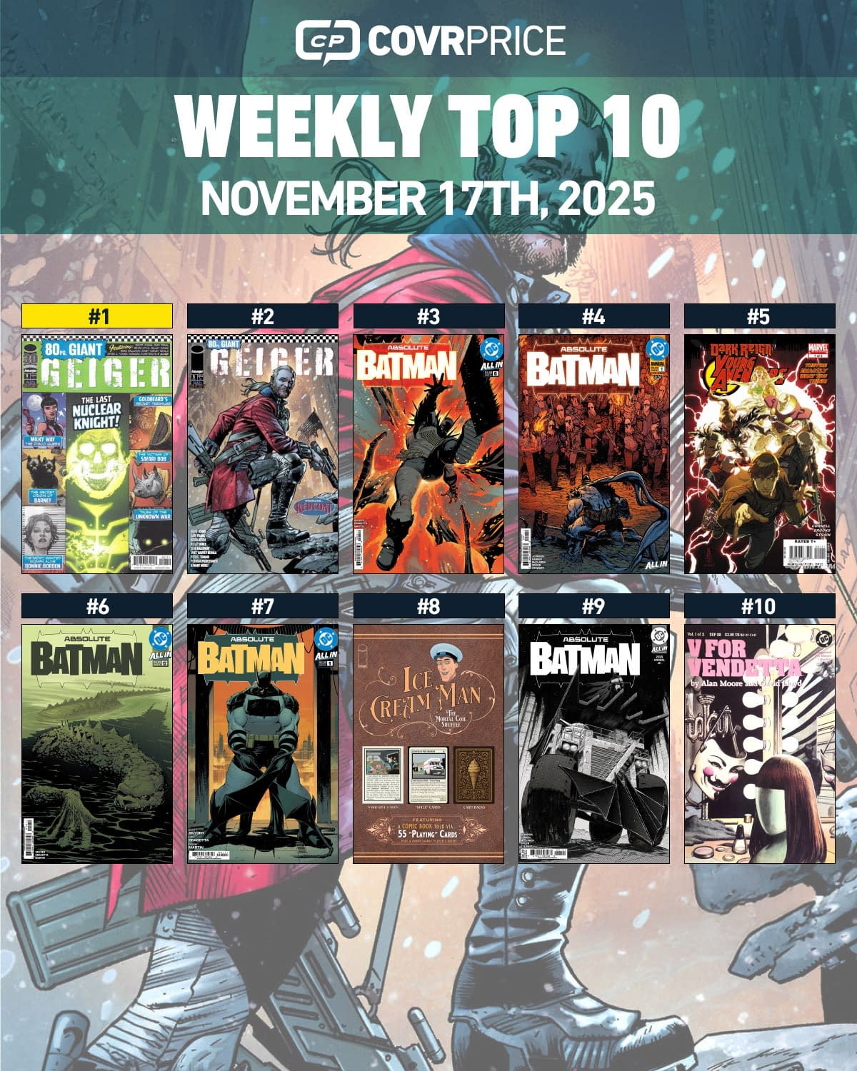 Courtesy of Covrprice and Bleeding Cool, comes the ten hottest comics books of the week. And a tag to keep up on previous editions. The news of a Redcoat movie has seen back issues of the Geiger 80-Page Giant, where the character first appeared, spike hard. And ahead of Absolute Batman #6, #12 and Annual. A trading card comic for Ice Cream Man, a V for Vendetta TV series and the first appearance of Lisa Molinari/Coat of Arms from Young Avengers, now that Lauren Morais has been cast in VisionQuest for Disney+ also pushed their names onto the List.
