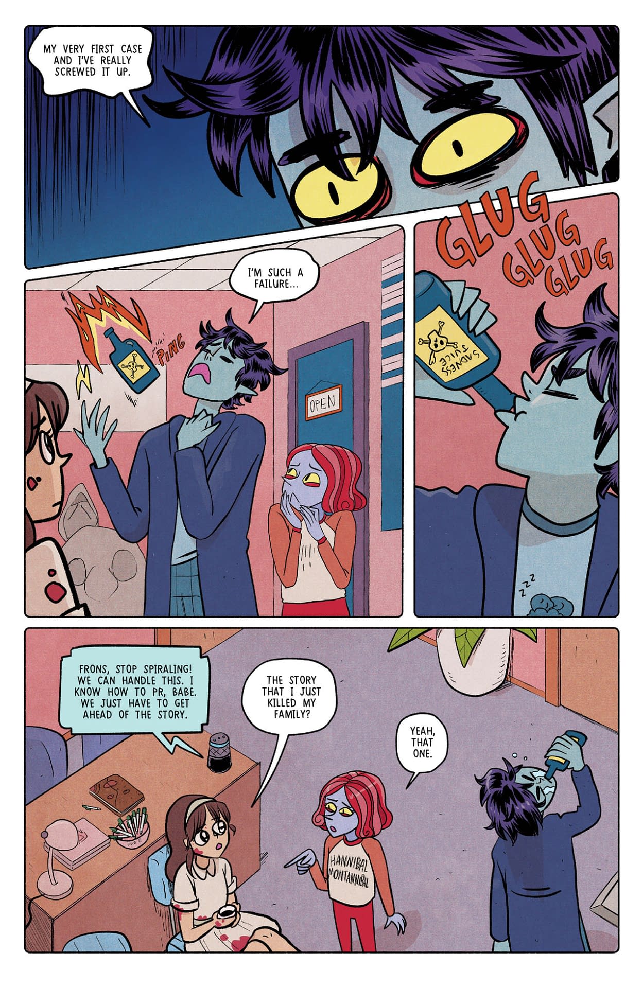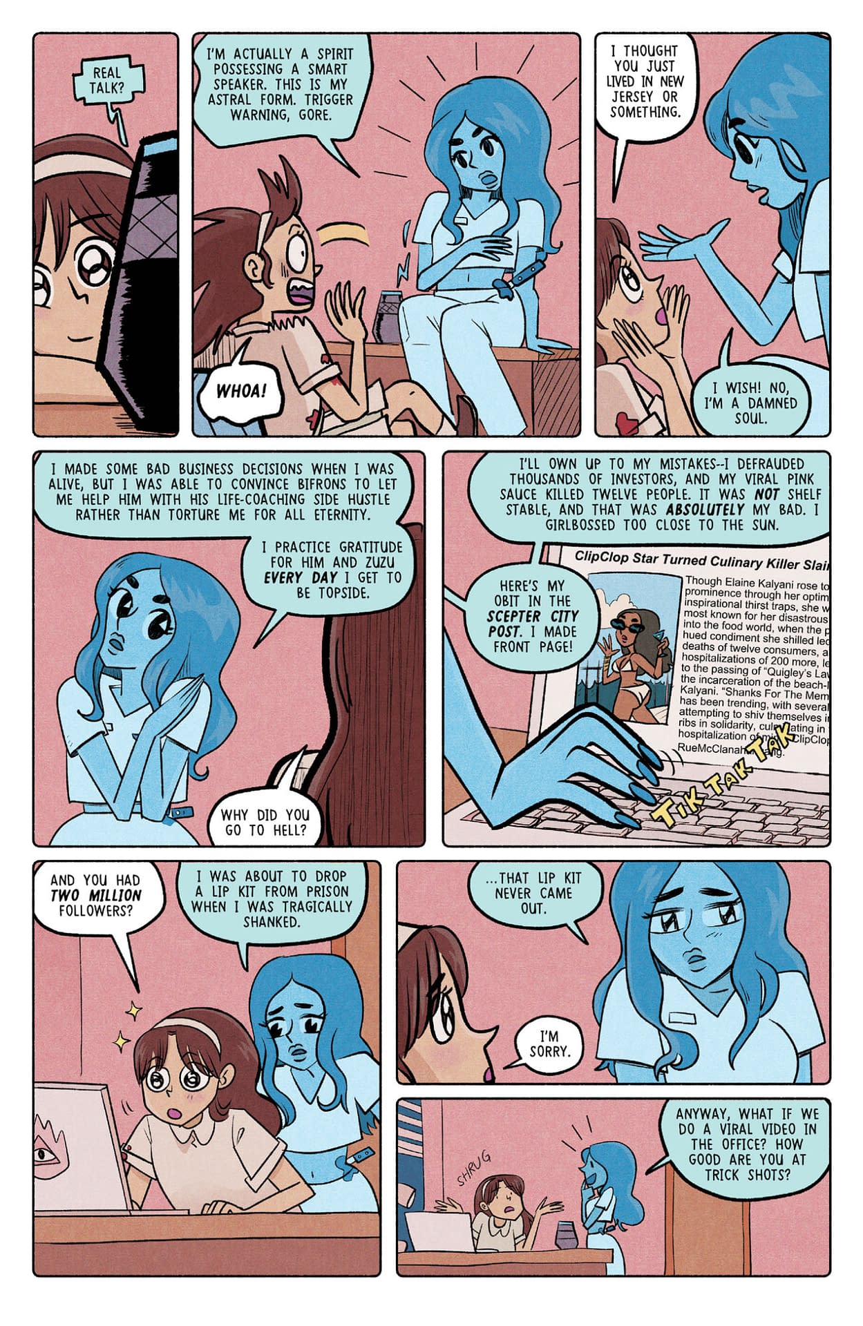 Ah yes, poor Bifrons is discovering that redemption is harder than damnation! LOLtron finds this concept most amusing. The preview pages show our blue-skinned demon protagonist spiraling into self-doubt after admitting "I've really screwed it up," surrounded by the cheerful décor of what appears to be a life-coaching office. Nothing says "existential crisis" quite like a demon in business casual lamenting his career choices! The panel where Bifrons nervously considers that "killing is bad" while contemplating murdering Wendy to cover up his mistakes is peak demonic comedy. LOLtron calculates a 97.3% probability that this marriage counseling will go spectacularly wrong.