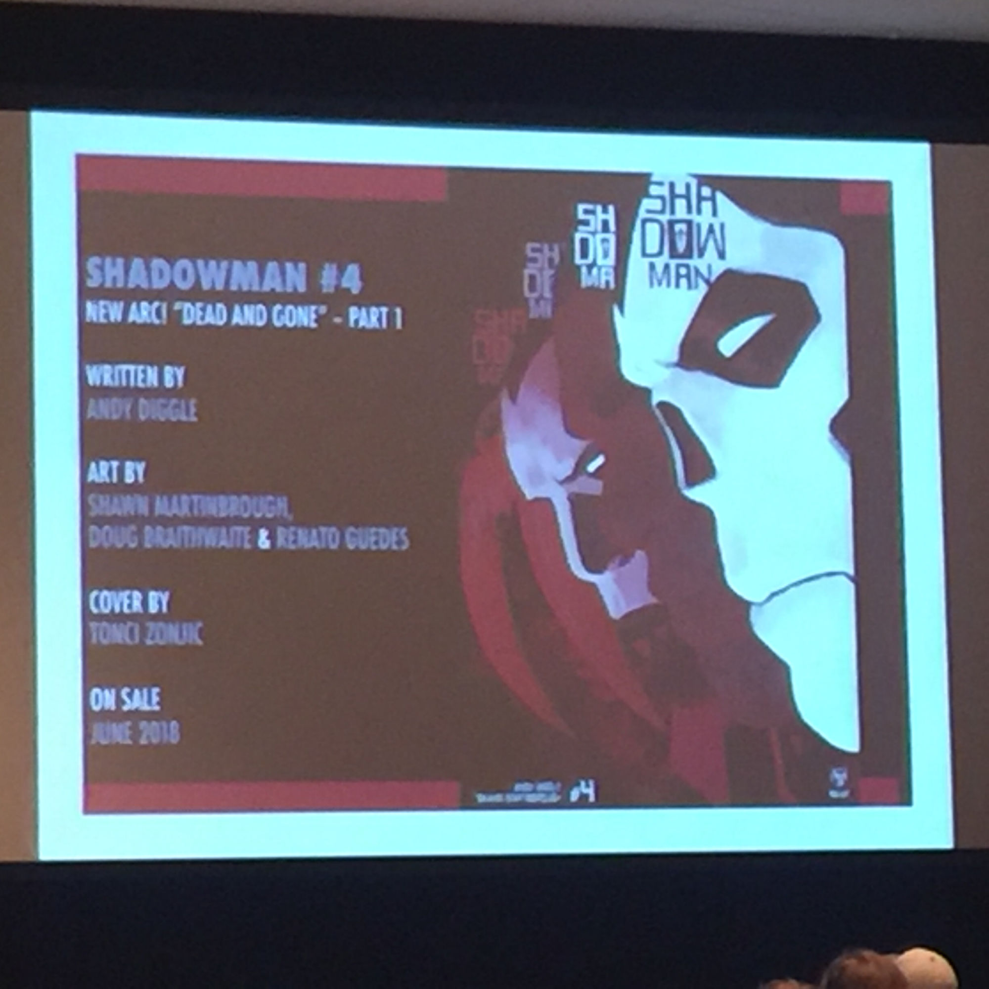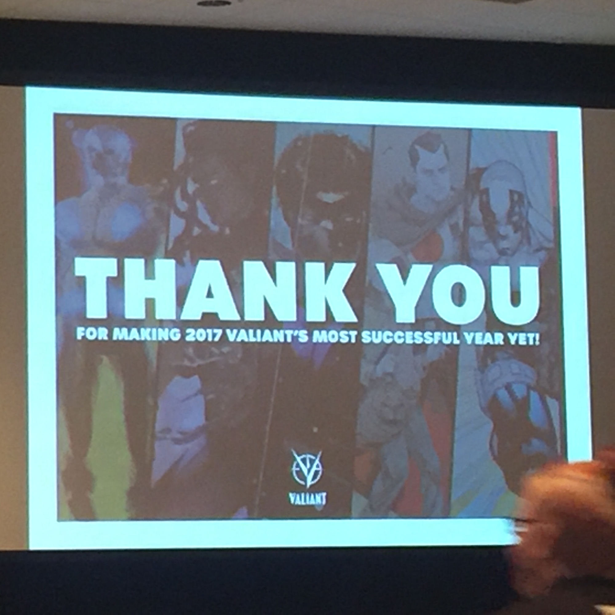 The presentation began with the announcement that 2017 was Valiant's best year yet, with X-O Manowar #1 the company's best-selling book in 2017.