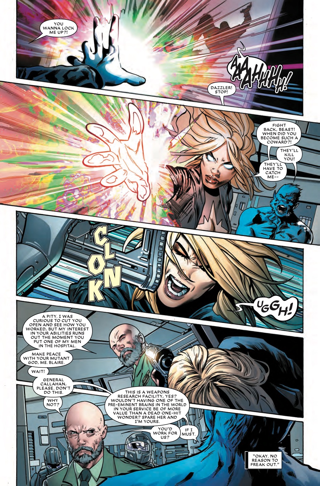 It's unclear whether Beast is playing the evil General Callahan, or whether he's simply being true to his character, like when he sided against Cyclops, his childhood friend. Then again, Beast selling out may simply be a projection of writer Matty Rosenberg, a former indie darling, becoming a hotshot Marvel Exclusive writer.