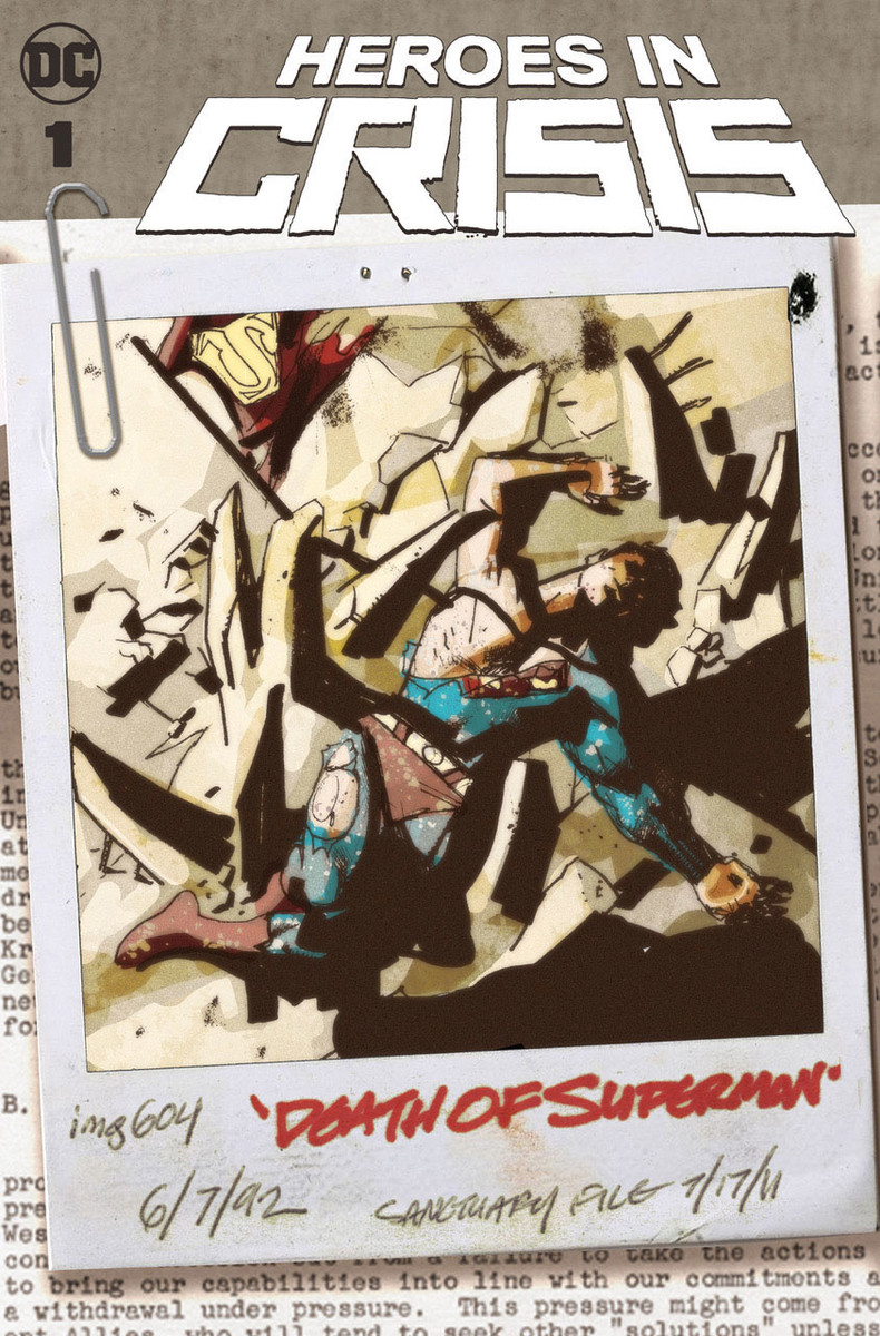 Following Sook's depiction of the death of Superman on the cover of issue one, Sook's subsequent HEROES IN CRISIS variants will focus on Batman's back being broken by Bane for issue two, Wonder Woman killing Maxwell Lord for issue three, Aquaman losing his hand for issue four, Jason Todd's death for issue five and Hal Jordan killing Kilowog for issue six. Issue seven will feature a special yet-to-be-announced Harley Quinn moment to round out the series. All of Sook's variants in this series will receive a spot varnish treatment to give a photo-finish shine to each case file snapshot.