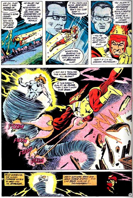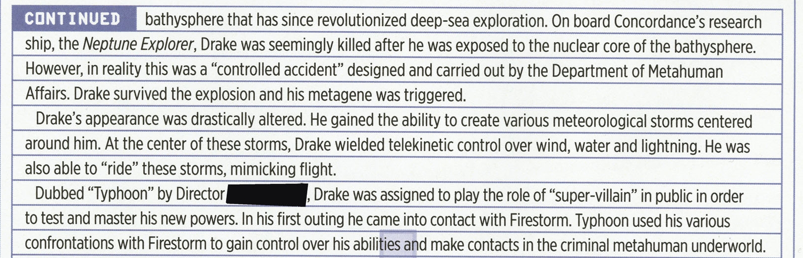 Typhoon is a relatively low-level villain in Firestorm comics. First appearing in Flash #294 in 1981, a colleague of Martin Stein, David Drake, was exposed to radiation and ocean water and developed the ability to control weather. He repeatedly fought Firestorm, whom he learned to hate.