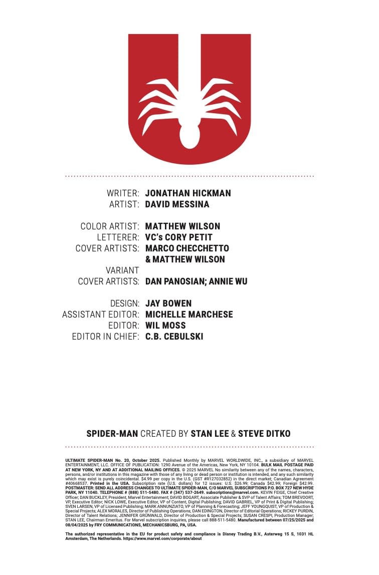 - Cover image for 75960620796102016 ULTIMATE SPIDER-MAN #20 DAN PANOSIAN VARIANT, by Jonathan Hickman & David Messina, in stores Wednesday, August 27, 2025 from Marvel
