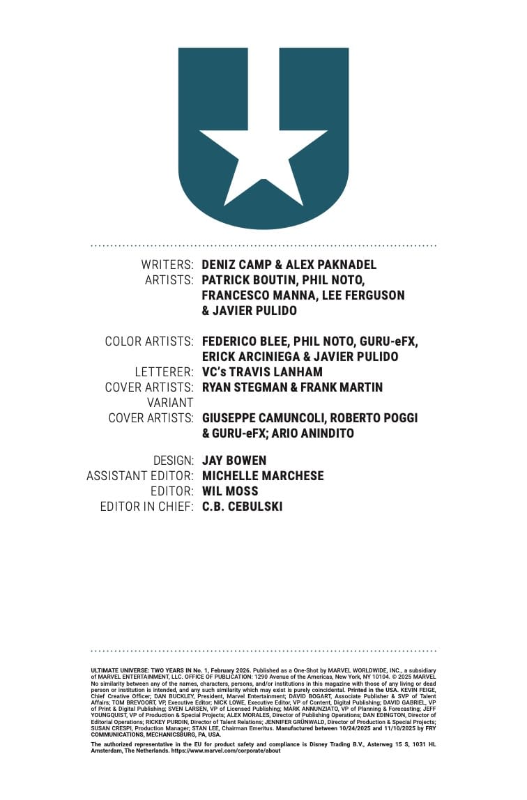 - Interior preview page from 75960621248400111 ULTIMATE UNIVERSE: TWO YEARS IN #1 RYAN STEGMAN COVER, by Deniz Camp & Alex Paknadel & Phil Noto & Francesco Manna & Ryan Stegman, in stores Wednesday, December 3, 2025 from Marvel