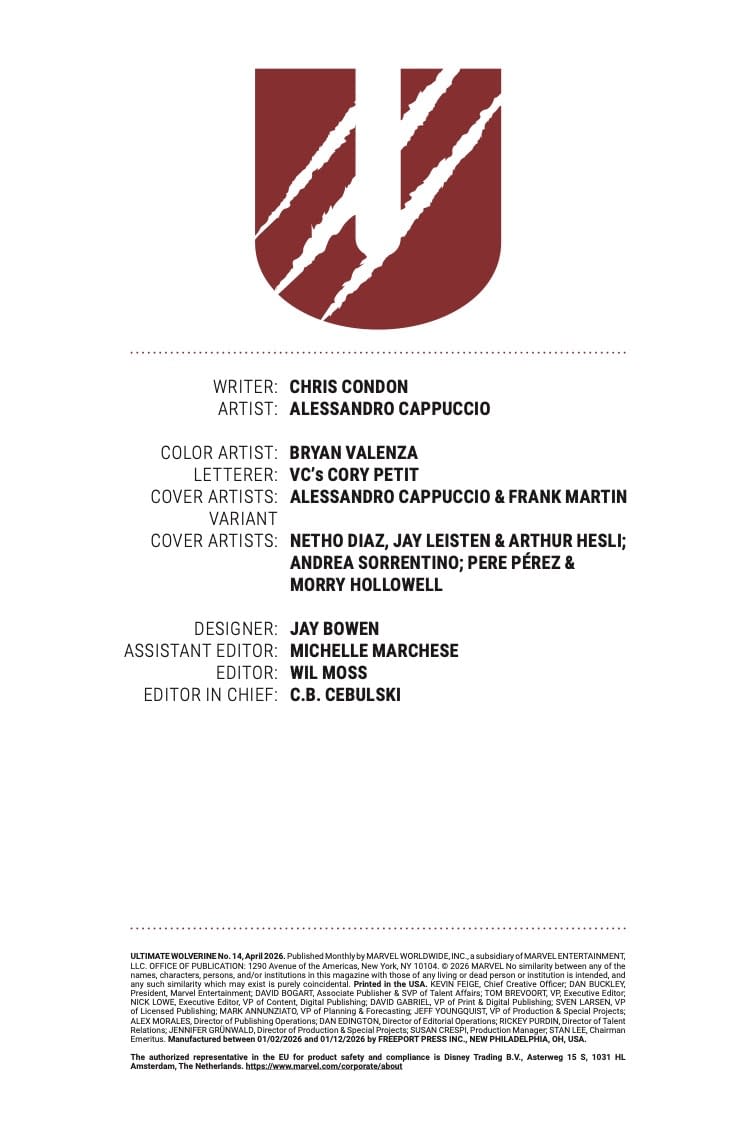 - Cover image for 75960621050301411 ULTIMATE WOLVERINE #14 ALESSANDRO CAPPUCCIO COVER, by Christopher Condon & Alessandro Cappuccio & Alessandro Cappuccio, in stores Wednesday, February 4, 2026 from Marvel