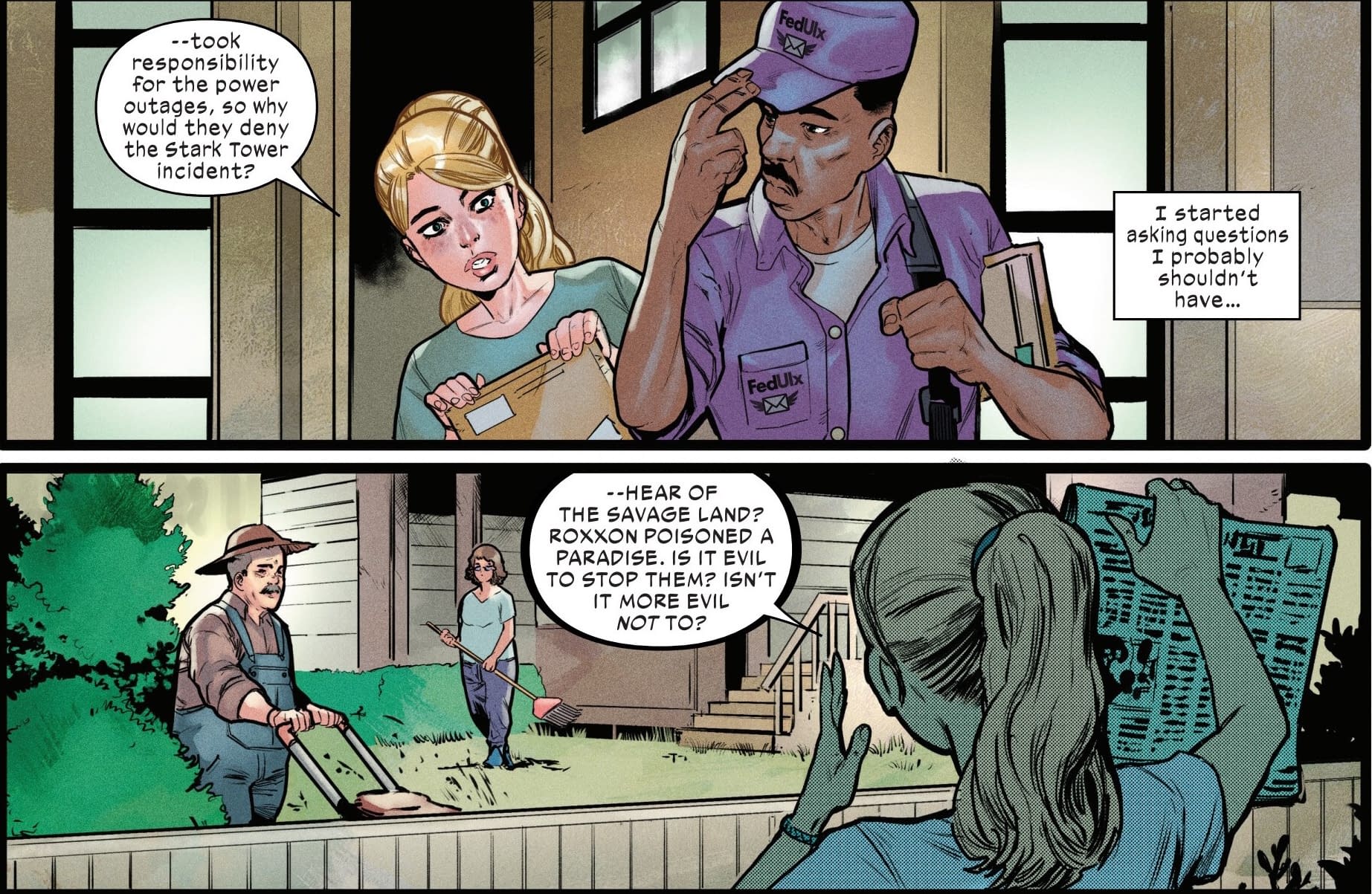 - Powerful corporations like Roxxon and Oscorp now control society, enforcing fascist order and civil functions.