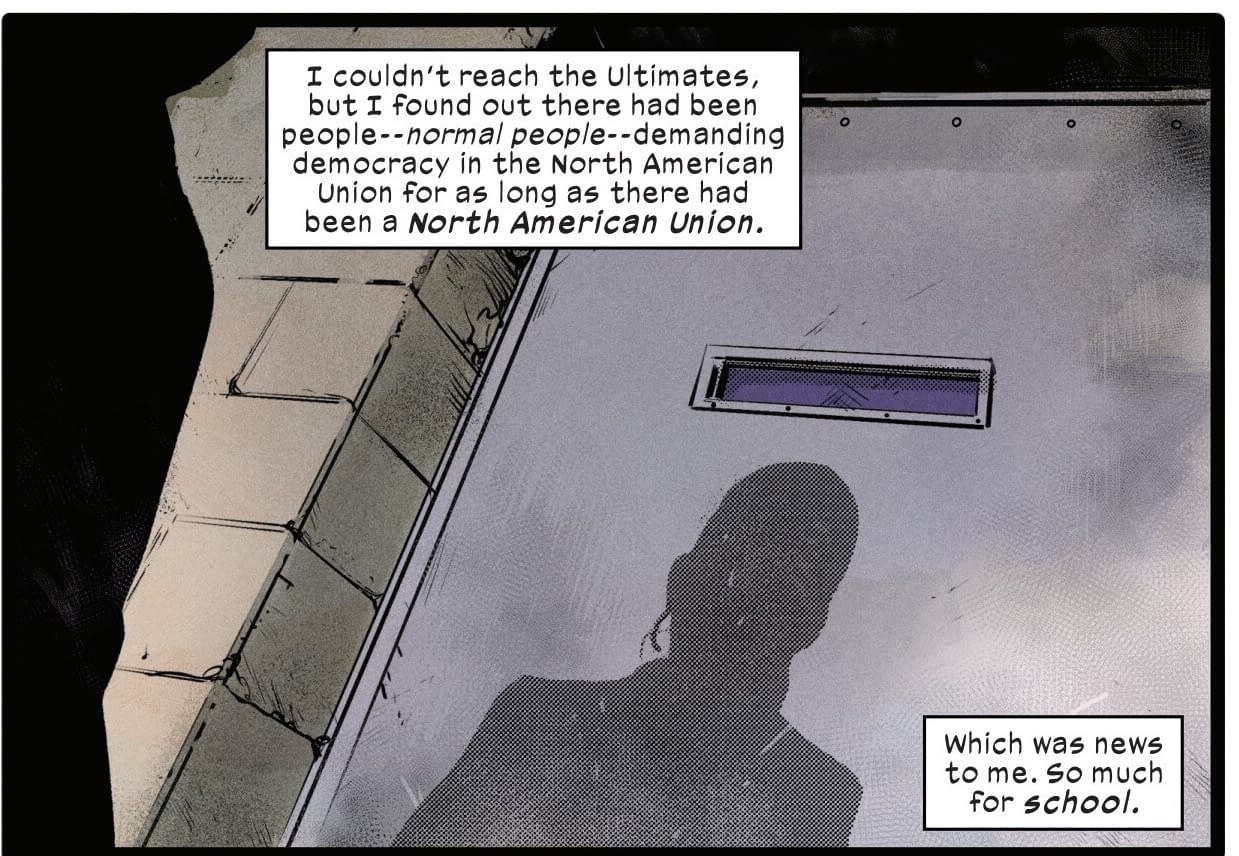 The New History Of The DC Universe is a little on the late side right now. So why not have a history of the new Ultimate Universe? We have seen how The Maker took superheroes out of the equation, as well as the new power structures around the world. But we also get a little history as to how this whole state of events came to pass in today's Ultimates #16 by Deniz Camp and Juan Frigeri, with New York now as part of the Northern Union rather than the United States Of America.