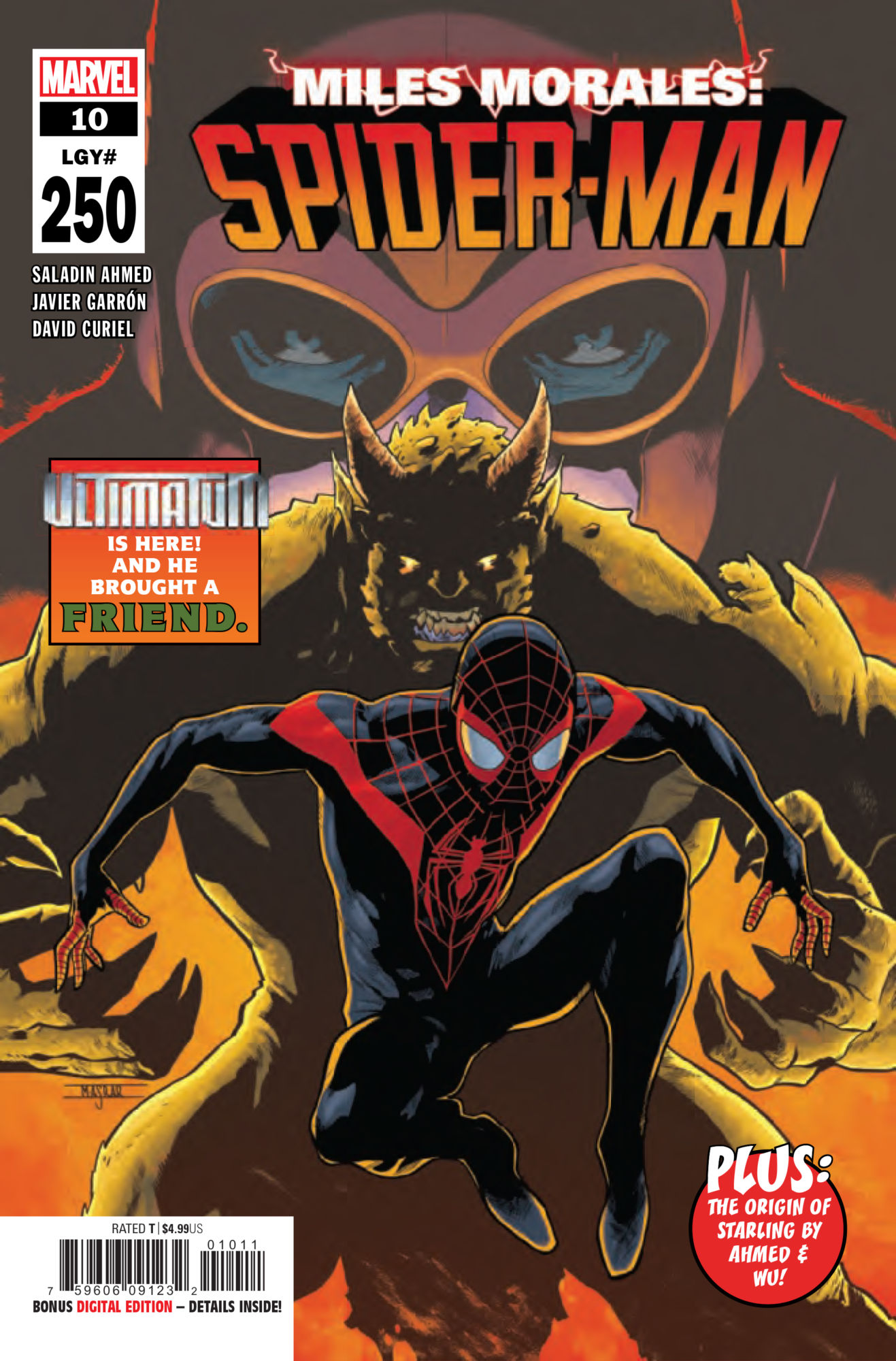 That's right, it's our 250th issue and it's Miles Morales' birthday! But YOU'RE getting all the gifts! A mystery dating back to Miles' first appearance? Answered! A terrifying villain destined to become one of Miles' greatest adversaries? Revealed! Special guests, like maybe Peter Parker: Spider-Man? YOU KNOW IT! All busting out of 25 pages by main series storytellers Saladin Ahmed and Javier Garr n, PLUS a bonus back-up by Ahmed and a special guest artist delving into the history of your new favorite character, STARLING! Your FOMO is well-founded! DON'T MISS IT!