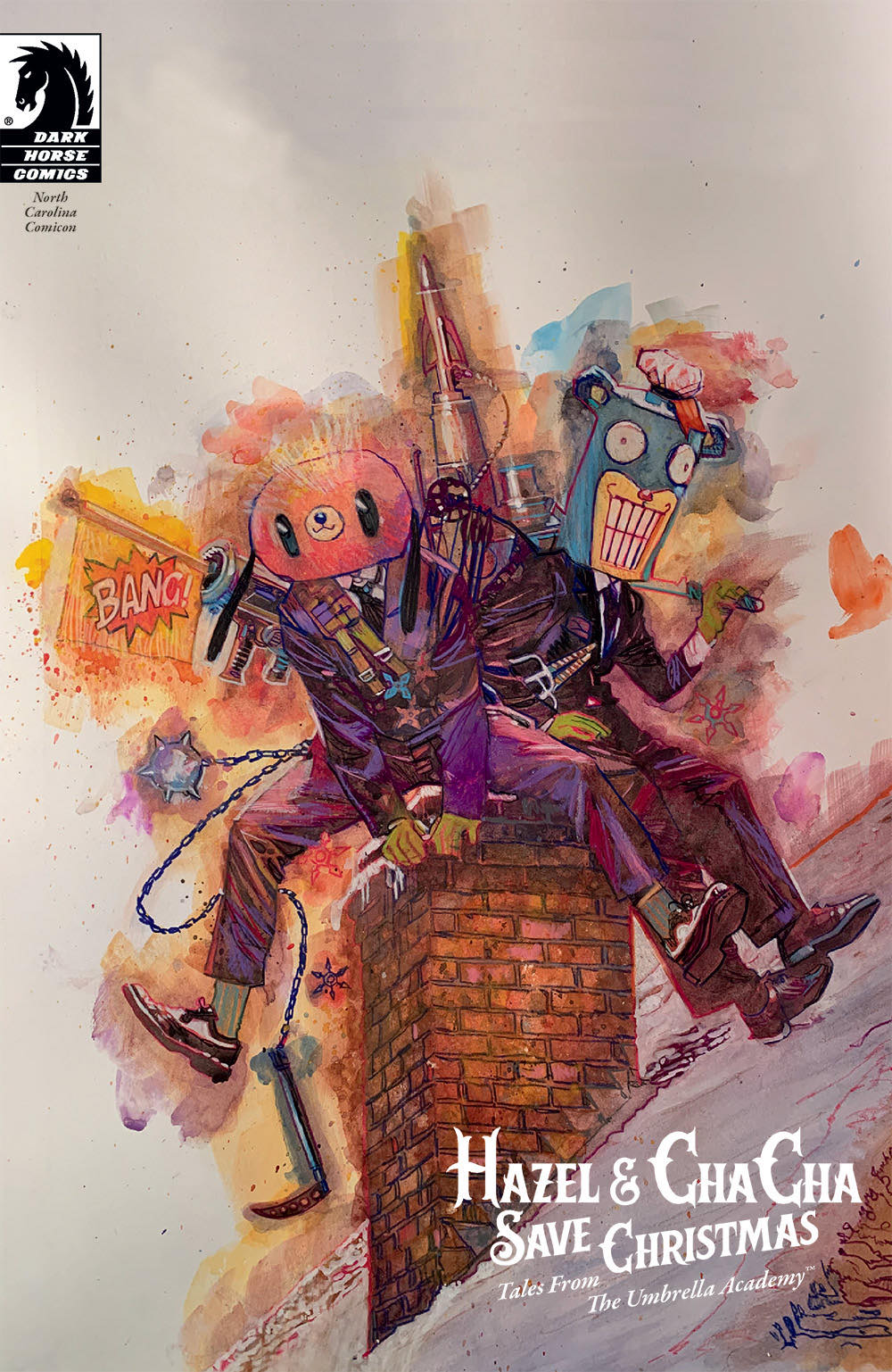 Gerard Way, Scott Allie and Tommy Lee Edwards are putting out a new one-shot Umbrella Academy comic from Dark Horse, Hazel and Cha Cha Save Christmas: Tales from the Umbrella Academy published on November 20th. But if you go to NC Comicon at the Durham Convention Centre, North Carolina, you can pick up a copy twelve days early. Limited to 500 copies, it will also have an NC Comicon-exclusive variant cover by Edwards.