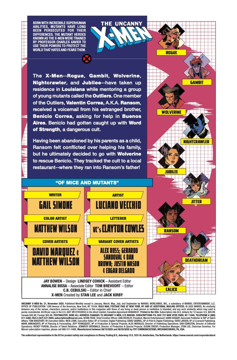 - Interior preview page from 75960620917002111 UNCANNY X-MEN #21 DAVID MARQUEZ COVER, by Gail Simone & Luciano Vecchio & David Marquez, in stores Wednesday, September 17, 2025 from Marvel