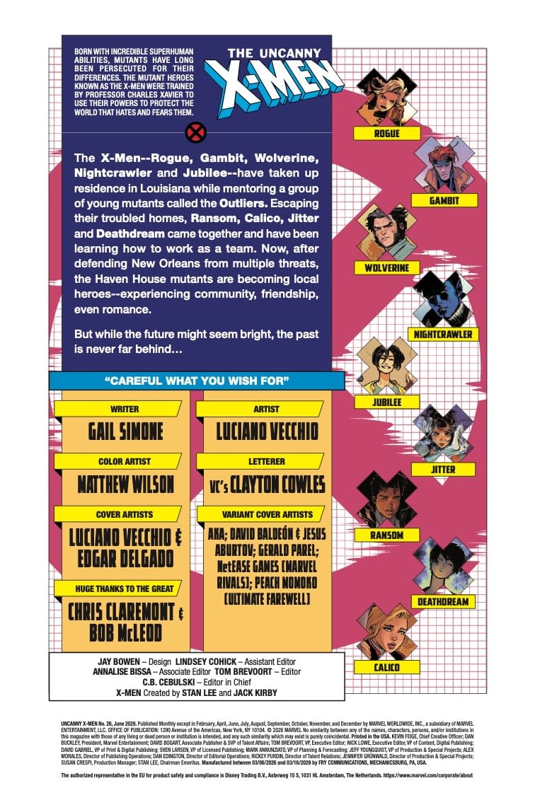 - Cover image for 75960620917002621 UNCANNY X-MEN #26 AKA ROGUE VARIANT, by Gail Simone & Luciano Vecchio, in stores Wednesday, April 8, 2026 from Marvel