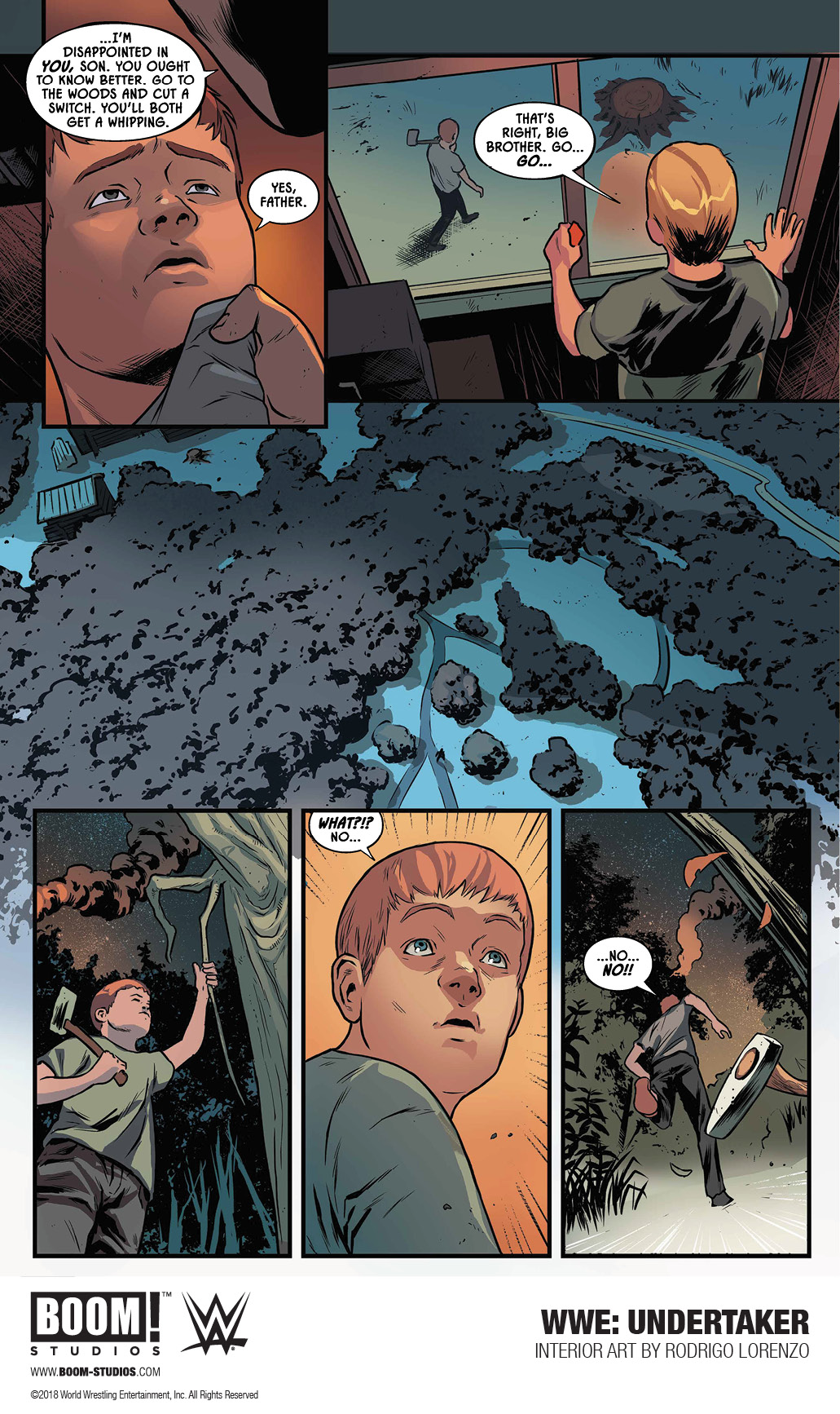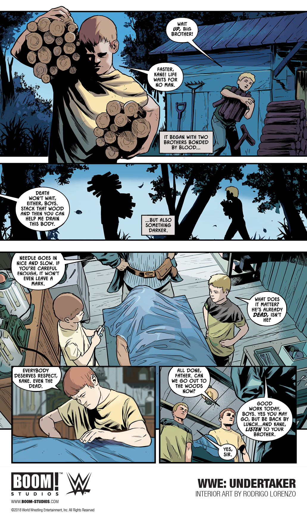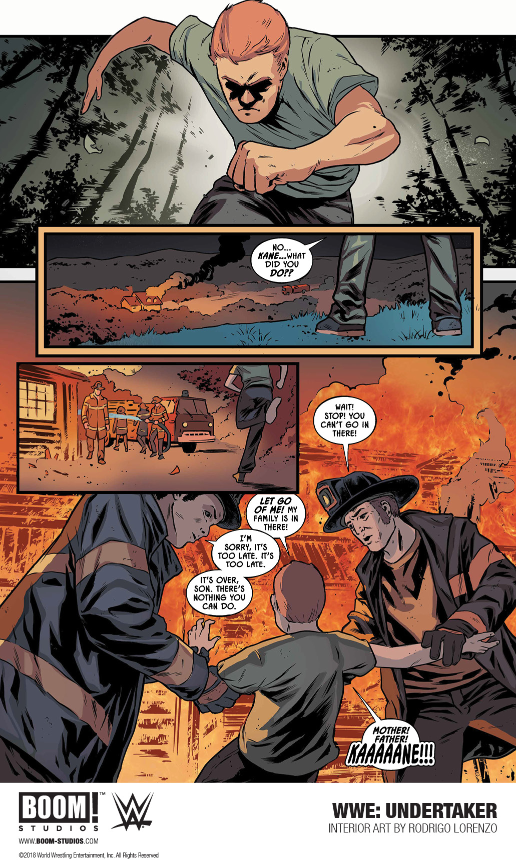 Following up on news that they'd sent 20-page excerpts of their upcoming Undertaker original graphic novel to 2 million WWE Network subscribers, explosive comic book publisher BOOM! Studios continues to aggressively market the book with a preview containing some pretty big spoilers, and even bigger accusations. As all WWE fans know, Undertaker's parents were killed in a fire when the Undertaker was a child. Conflicting accounts of the fire's origin have existed for decades. According to the Undertaker's former manager, Paul Bearer, the Undertaker himself lit the fire, both killing his parents and permanently disfiguring Undertaker's half-brother and current mayor of Knox County, TN, Kane. However, Undertaker later blamed Kane for the fire, calling him a pyromaniac, though he later did admit to setting the fire himself. Making matters more confusing, Kane, who long wore a mask to hide his disfigurement, was later revealed to be perfectly healed underneath the mask.