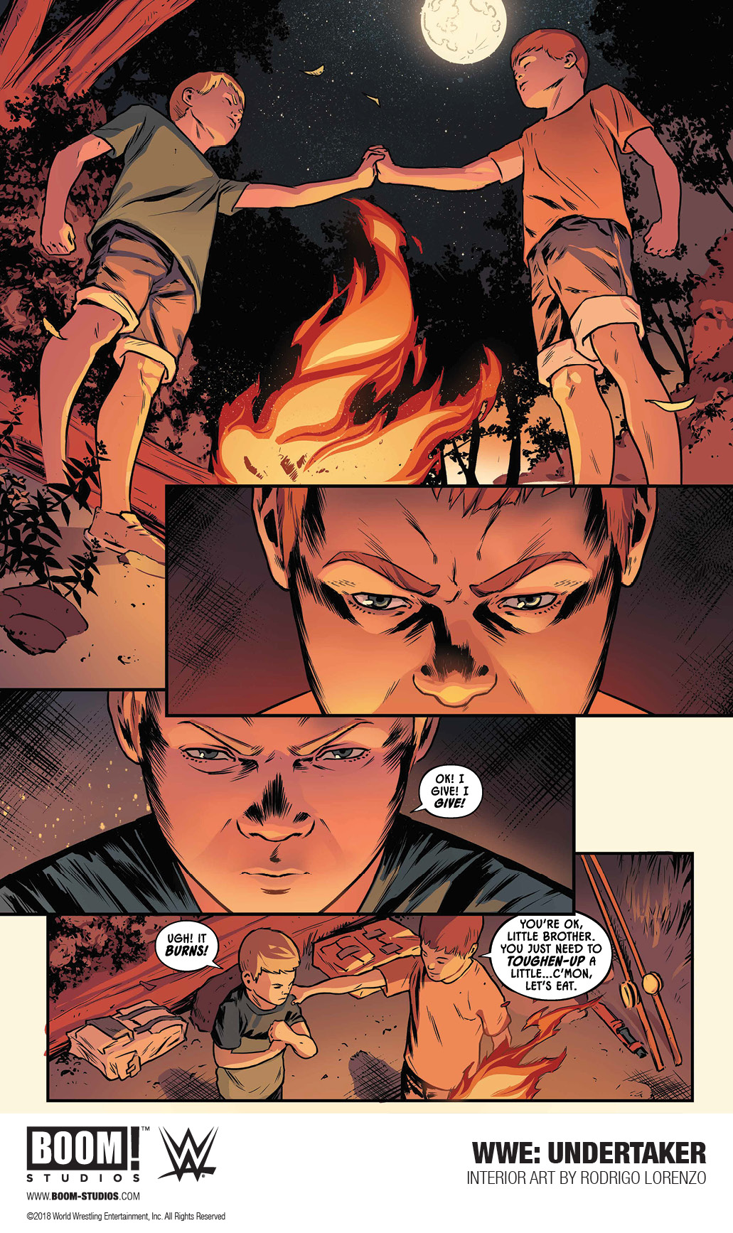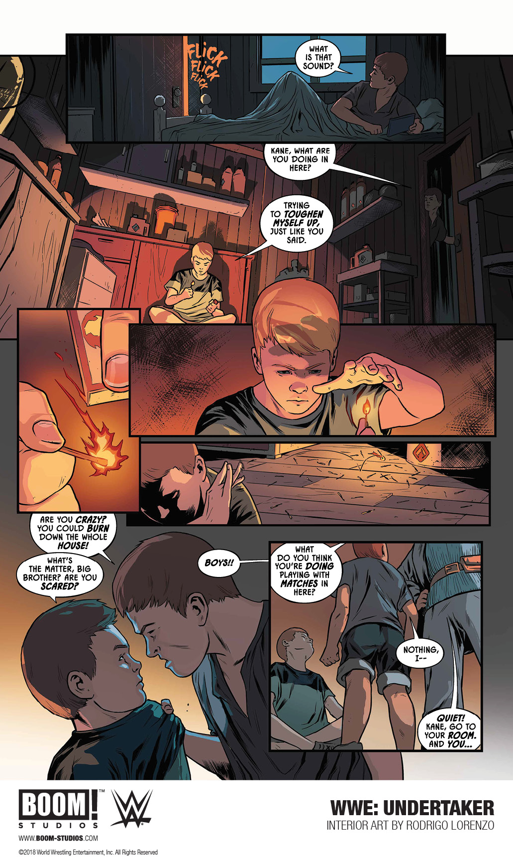 However, in this new preview of Undertaker: Rise of the Deadman, presumably the same one that was sent to WWE Network subscribers, we learn that it actually was Kane who set the fire, though it seems the truth of the circumstances is more nuanced than anybody could have thought. The comic shows that Kane set the fire to save his older brother from their abusive father, not because of pyromania. Further, it seems to be respect and admiration for his older brother that drove Kane to play with matches in the first place.