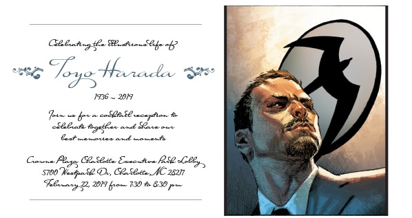 Valiant will host an hourlong reception for ComicsPRO attendees to celebrate the life of Toyo Harada from 7:30-8:30 pm on Friday, February 22nd. Guests will receive a Valiant tie and in memoriam cards and have a chance to sign the late Mr. Harada's guest book. Funeral attire is encouraged but not required. It's what the late and great Mr. Harada would want, after all. He may be gone, but his memory lives on in THE LIFE AND DEATH OF TOYO HARADA #1 by Joshua Dysart and CAFU, on sale March 13th.