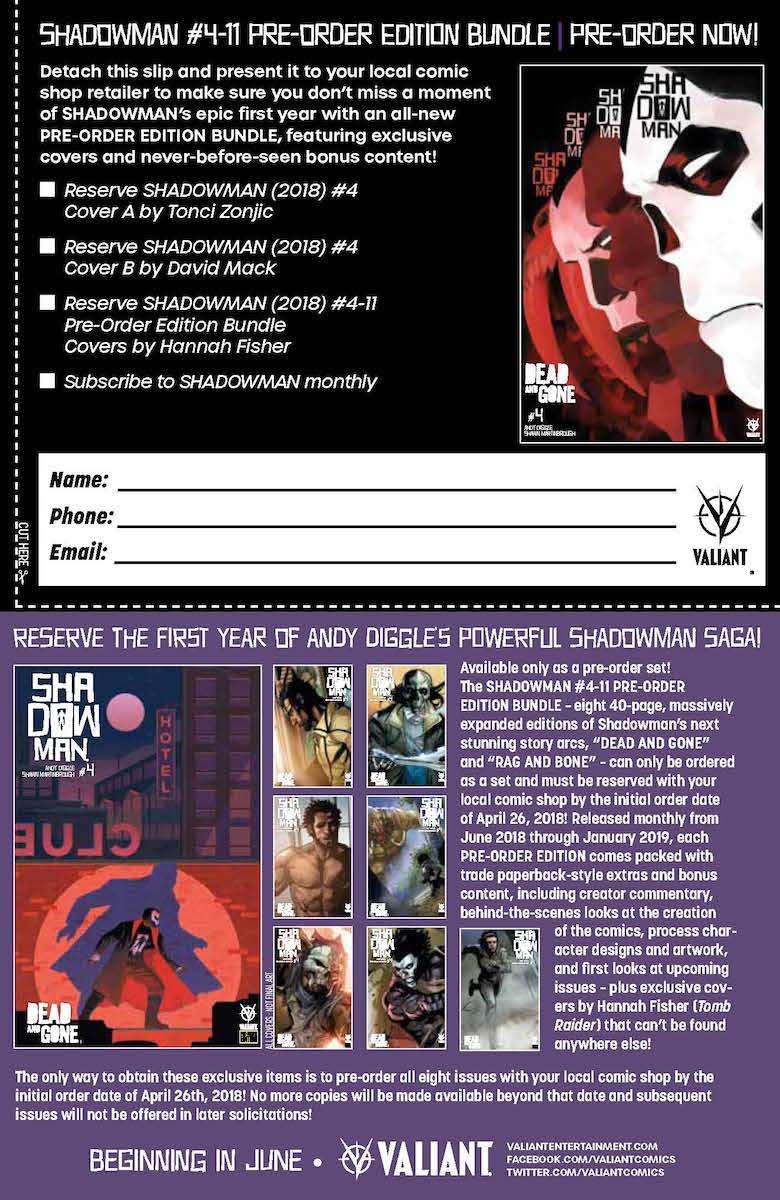The SHADOWMAN #4-11 PRE-ORDER EDITION BUNDLE–eight 40-page, massively expanded editions of Shadowman's next stunning story arcs, "DEAD AND GONE" and "RAG AND BONE" – can only be ordered as a set and must be reserved with your local comic shop by the initial order date of April 26, 2018! Released monthly from June 2018 through January 2019, each PRE-ORDER EDITION comes packed with trade paperback-style extras and bonus content, including creator commentary, behind-the-scenes looks at the creation of the comics, process character designs and artwork, and first looks at upcoming issues – plus exclusive covers by Hannah Fisher (Tomb Raider) that can't be found anywhere else!
