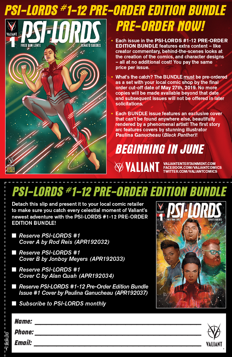 New York, NY (May 7, 2019) – Valiant is thrilled to announce the PSI-LORDS #1-12 PRE-ORDER EDITION BUNDLE, giving readers an opportunity to reserve the first 12 issues of the publisher's upcoming sci-fi mystery series to receive bonus content and exclusive covers, all for no additional cost.