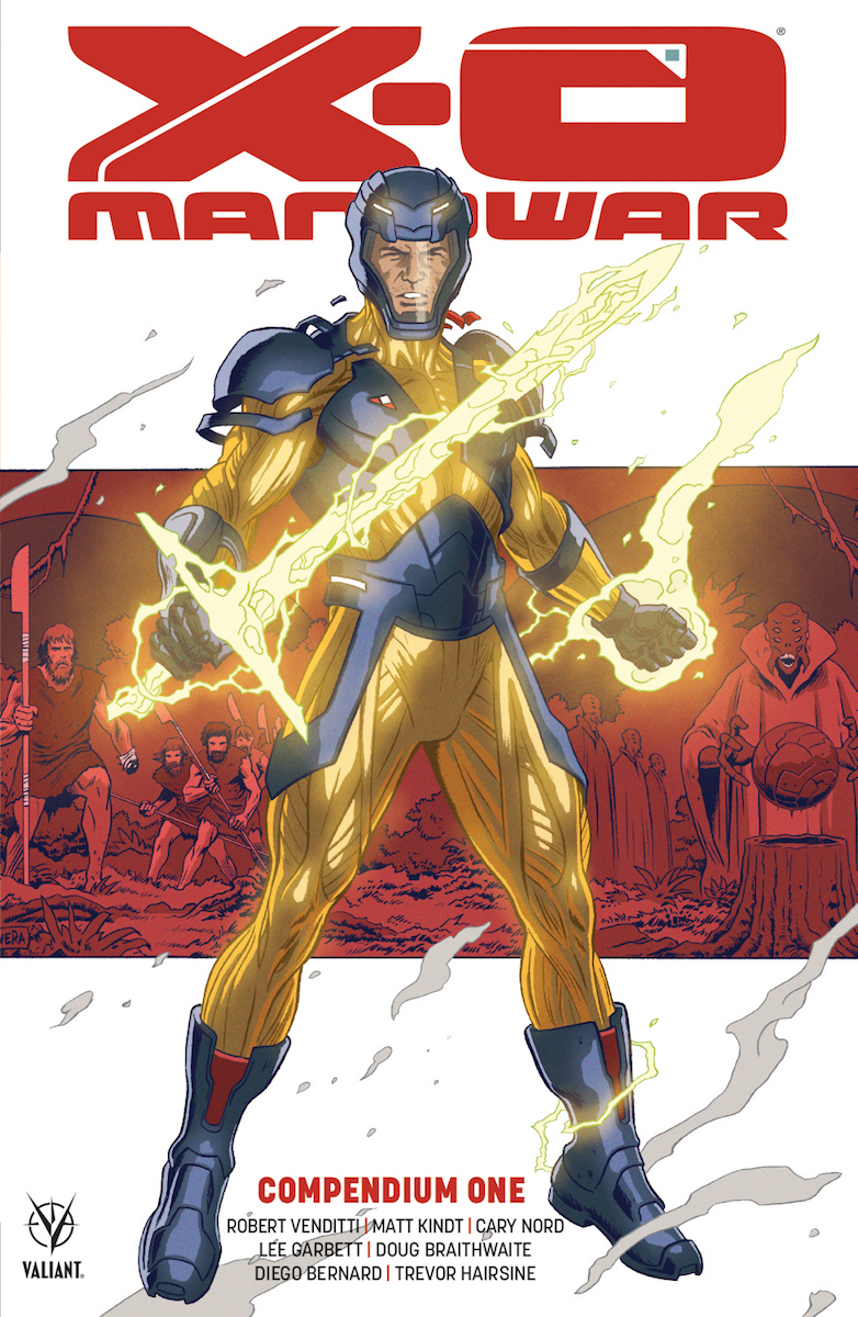 Valiant Entertainment will publish an 880 page X-O Manowar compendium this August, the perfect way to enjoy the chart-topping, award-winning series that relaunched the Valiant Universe in a value-priced softcover format, and also the perfect tool with which to bludgeon to death insolent fools who dare interrupt you while you're reading it. From the press release: