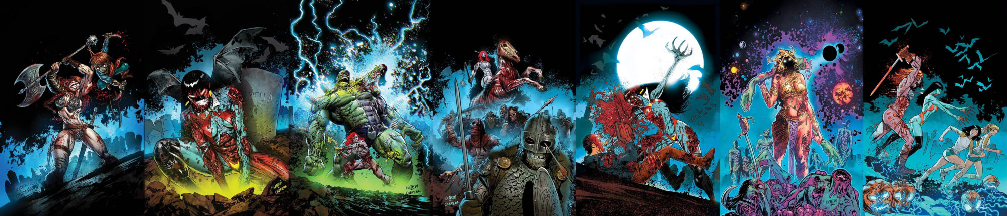 In March, Dynamite Entertainment will be running zombie-themed covers by Juan Gedeon across all their comic books. Whether they fit the franchise – or not. He is contributing 7 special connecting covers across the Dynamite line, with their characters trying to survive and fight against the apocalyptic virus, or succumbing to it themselves. Fans can collect them all and imagine the untold connecting narrative between them. Gedeon says "I always see Vampirella and Red Sonja portrayed as beautiful women, so I wanted to do the exact opposite for this! I'm glad that I got away with all this gore I drew. My biggest inspiration for this was Spawn and the Argentinean comic Cazador drawn by the beast Mauro Cascioli, his art was like Simon Bisley gone Super Saiyan." Gedeon colors himself on the covers for Death to the Army of Darkness #2 and Red Sonja & Vampirella Meet Betty & Veronica #10. With colours by Carlos Cabrera for Vampirella #9, Vampirella/Red Sonja #7, Red Sonja #14 and Killing Red Sonja #1 and Mike Spicer on Dejah Thoris #4. And they all tessallate together…